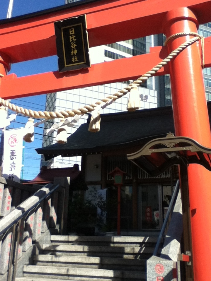汐留駅西側の交差点横にある神社。創建年代は不詳であるが、当初は日比谷に鎮座、その後現在の地に遷座された。歩道横に朱色の鳥居があり石段の先に拝殿がある。お勧めの点は、境内はあまり広くないが境内にいると心癒されること、参拝すれば願い事が叶うかもしれないこと、境内の掲示物などを読むこと等により日比谷神社の信仰や特徴について理解を深められること、拝殿は近代的なデザインで特に神社建築に関心のある人にとっては訪問する価値があることである。訪問時の感想は、他に参拝者はいなく、ゆっくり鮮やかな朱色の鳥居や近代的なデザインの拝殿、境内を見たり参拝することができ訪問して良かった。