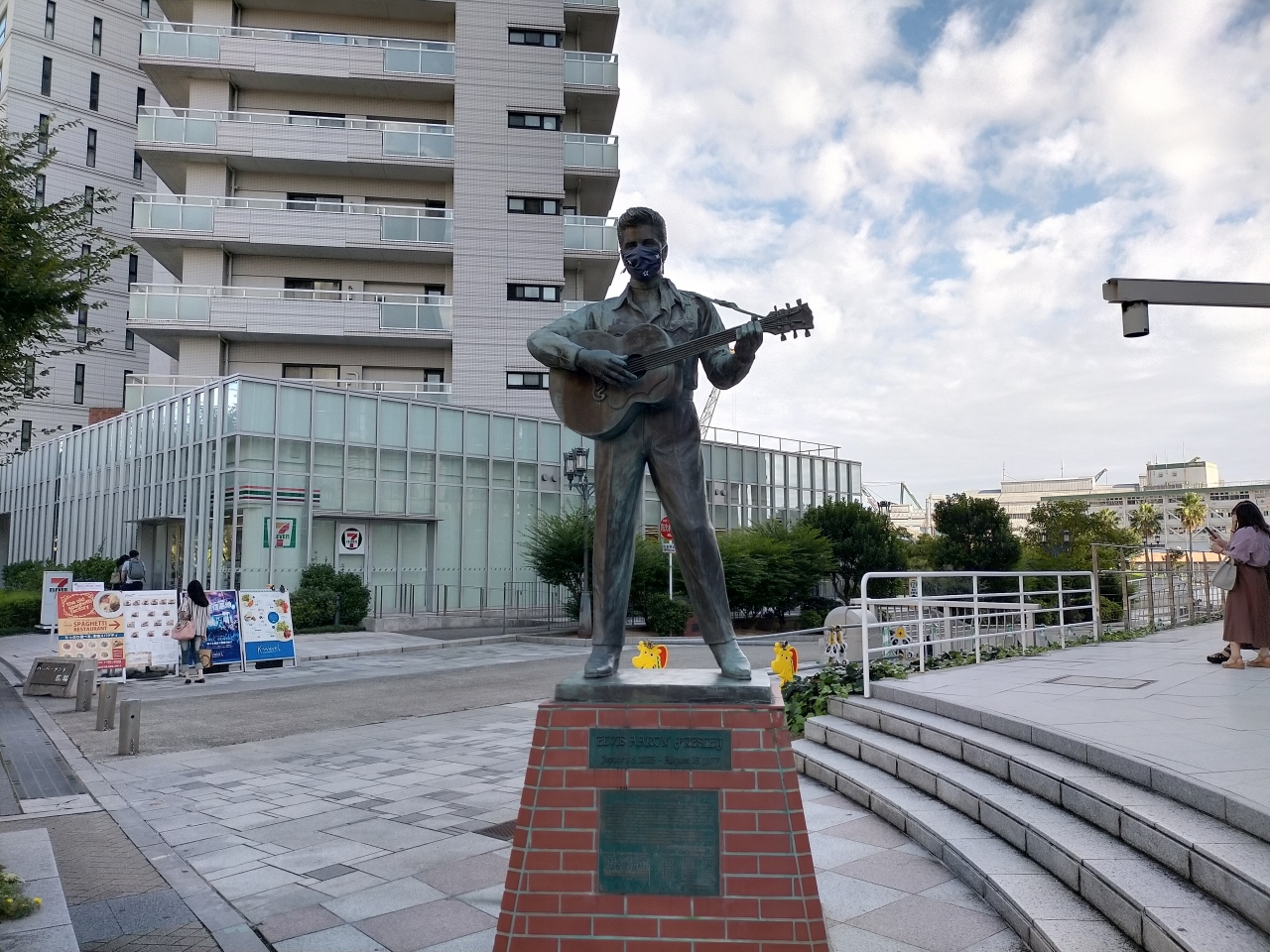 ハーバーランドのガス燈通りにエルビスプレスリーの像がありました。コロナ渦の影響でしょうかマスクをしていました。エルビスプレスリーは、アメリカのミュージシャン、映画俳優で、キング・オブ・ロックンロールと称される人物です。