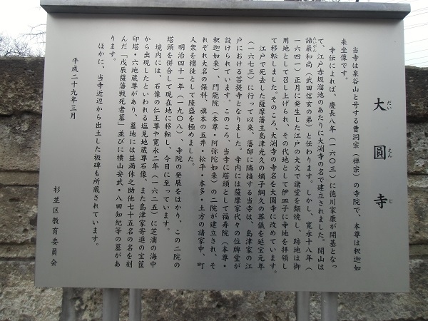 江戸で死去した薩摩藩主島津光久の嫡子綱久の葬儀を延宝元年(1673)に行って以来、藩邸に隣接する当寺は、島津家の江戸における菩提寺となったとのこと。