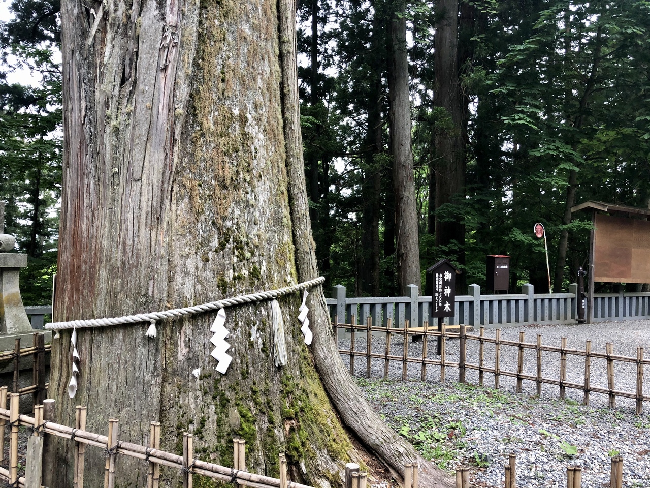 神聖な場所が持つ厳かな雰囲気が伝わってきます。まず目についたのが、圧倒的な大きさのご神木。 見上げると大きさが実感できます。諏訪大社に祀られている御柱よりも二回りは大きそうです。樹齢700年の年月は人間にとってはとてつもなく長い年月。これだけ立派な巨木には神様が宿っていても不思議ではありませんね。