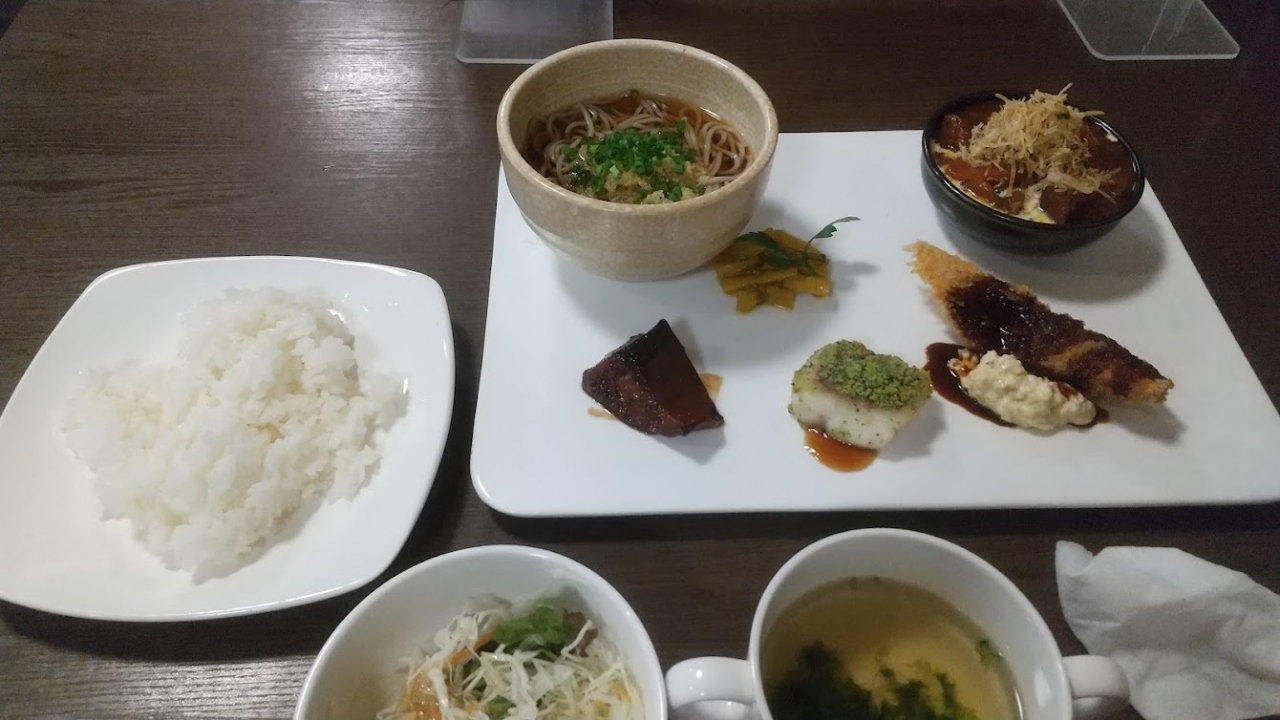 今日の日替わりランチは、冷たいそばとビーフカレー、魚の焼き物、揚げ物などを大皿にきれいに盛っています。これで800円は大満足です。