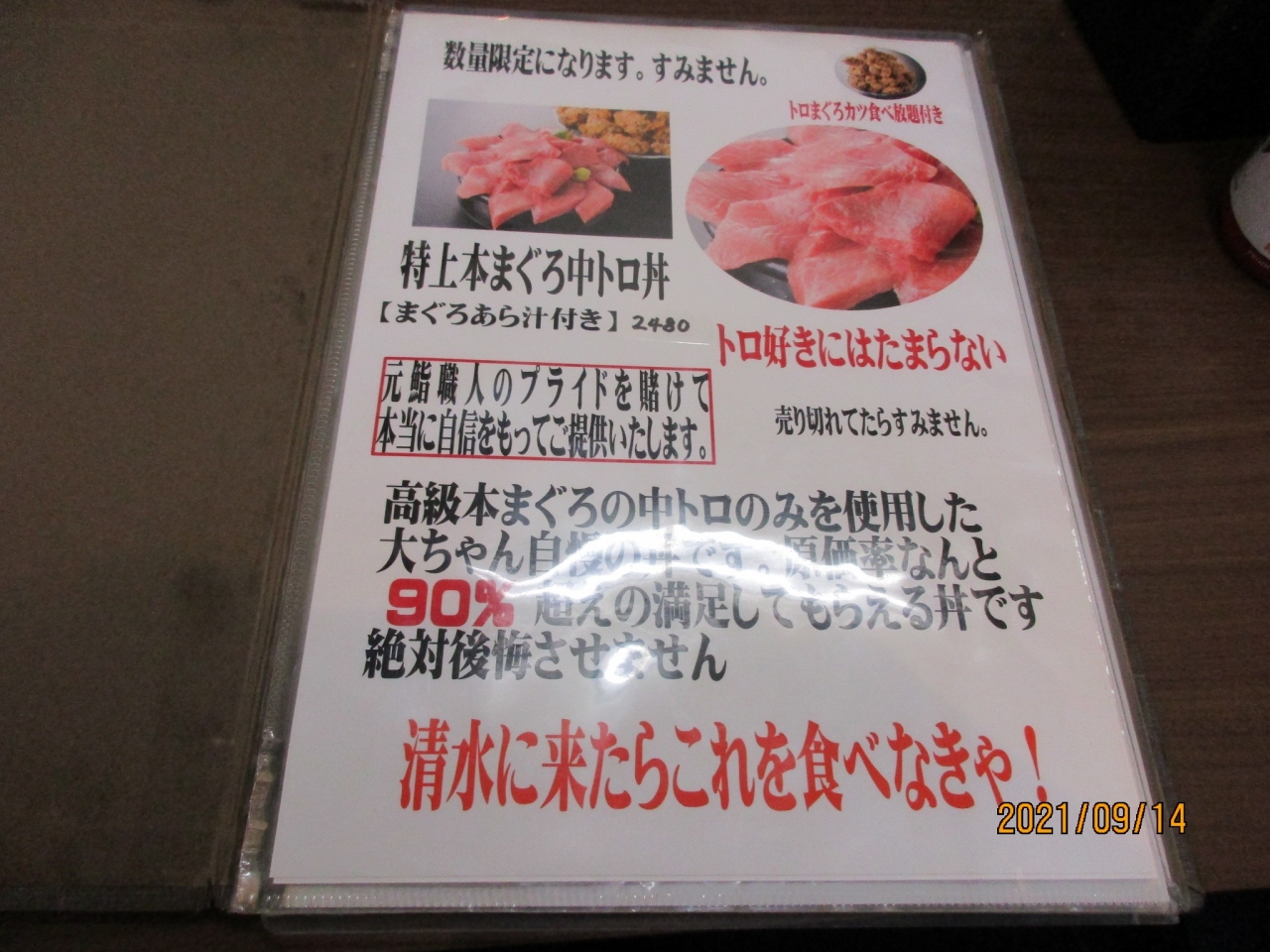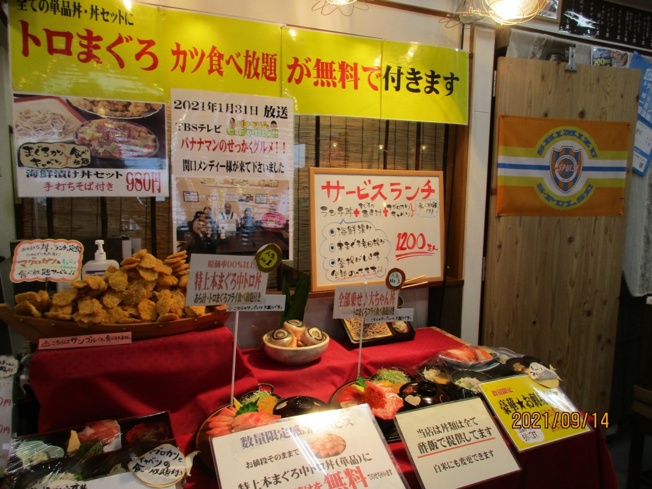 テレビで今年1月【バナナマンのせっかくグルメ】で紹介されたそうだ。中トロ丼が中トロメガ盛りで名物だったが、緊急事態宣言下で酒が飲めないので、熟慮の結果