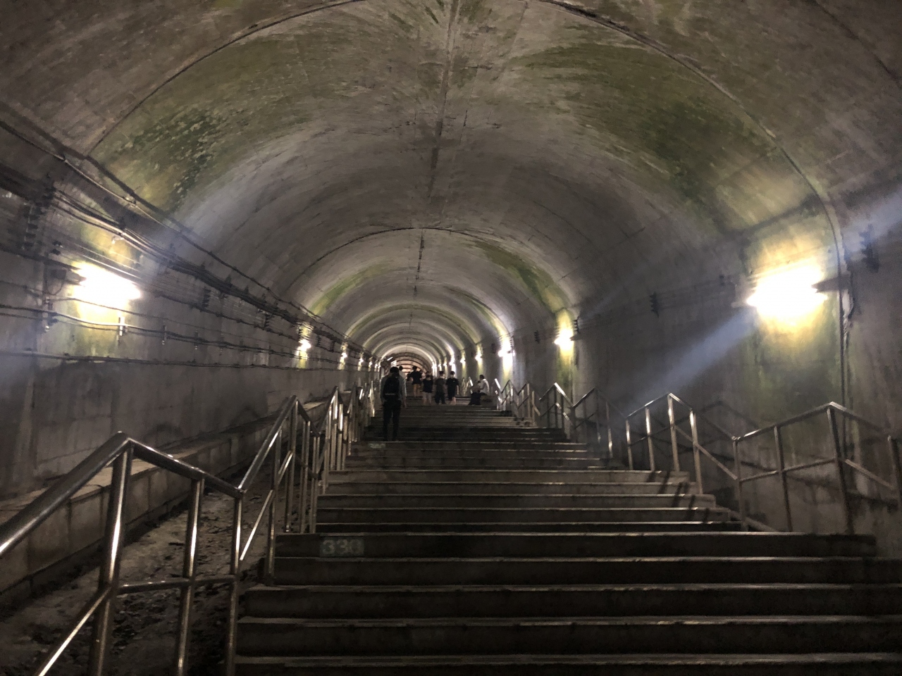 下りホームは地底にあり、出口まで400段以上の階段を上る必要があります。