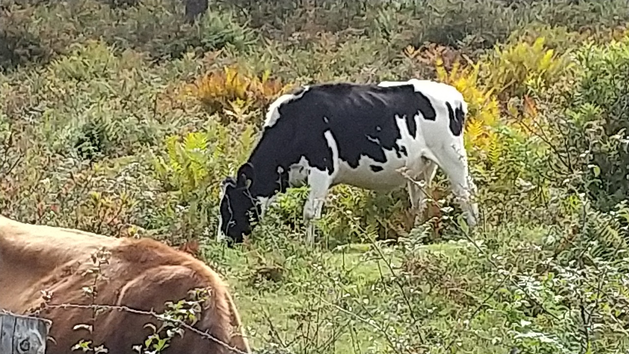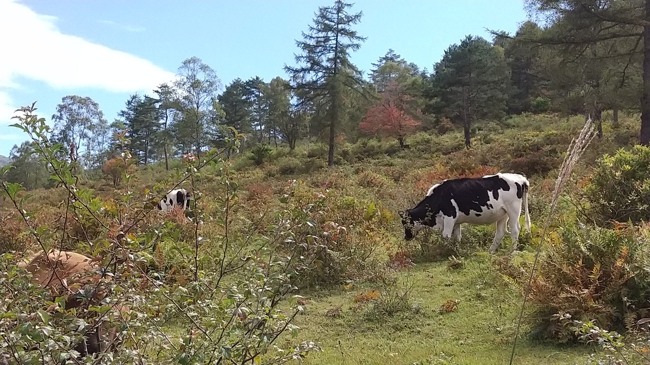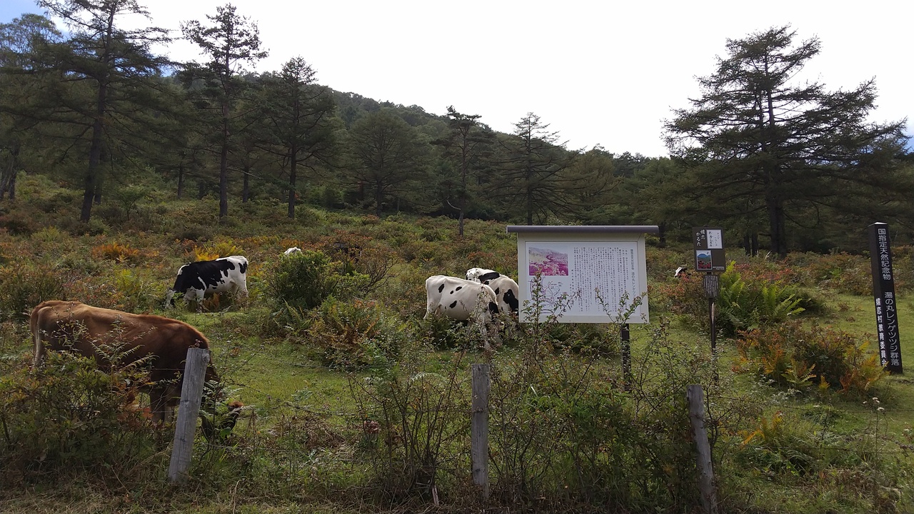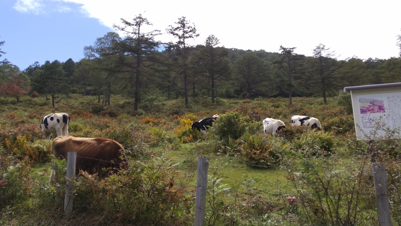 一帯はドウダンツツジの群生地。こんな場所に牛が放牧されているのが驚きの光景でした。シダ類も黄葉になり鮮やかな景色と牛が絵画のようでした。