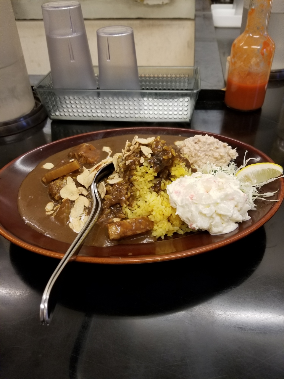 今日は黒カレーにポテサラ、ガーリックフライ、ツナサラダをトッピング。