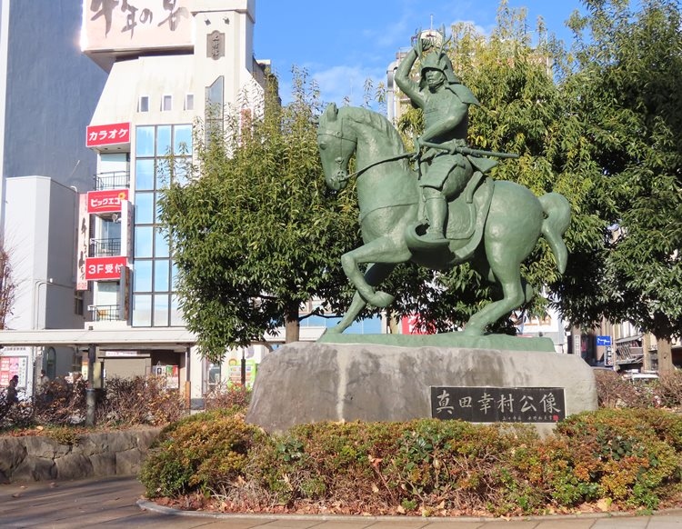 このときの旅テーマは前半に「北陸新幹線に乗る」があり、終盤に「大阪の名所をひとつでも多く回る」があったため、上田駅で活気のある真田幸村騎馬像を鑑賞した一週間後に、大阪天王寺の安居神社で真田幸村最期の像を見ることになりました。騎馬像は勇ましくかっこよくが当然で、天王寺の像は無念さを漂わせていて好対照で深く記憶に残りました。