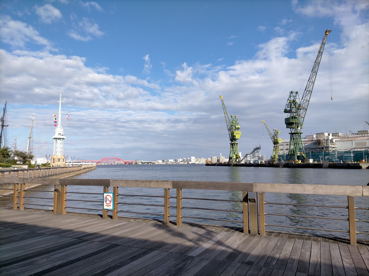 神戸大橋は、神戸市中心部と海に浮かぶ人工島「ポートアイランド」を結ぶ赤い色の橋です。この橋は、1970年に架けられた全長319mのダブルデッキアーチ型鋼橋です。ハーバーランドからも見ることができました。