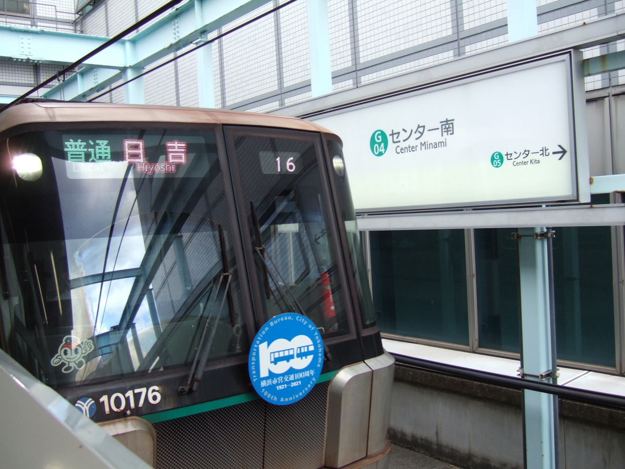 東横線の日吉から横浜線の中山駅を結んでいる地下鉄。車両はミニサイズで、車内はちょっと狭い感じがします。センター南からセンター北まで利用しましたが、前面には横浜市営交通100周年のヘッドマークが付けられていました。