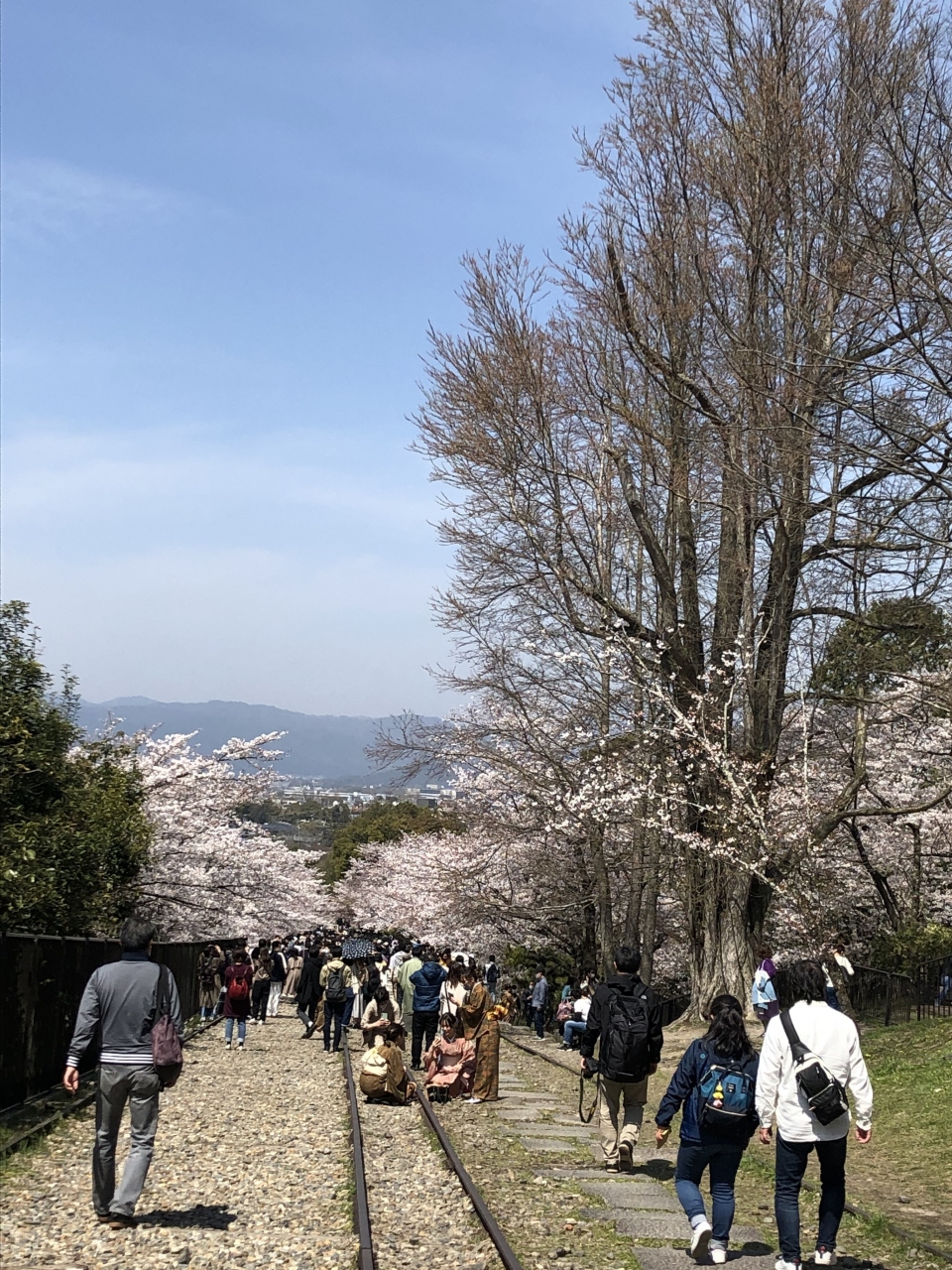 舟運ルートで使われていた傾斜鉄道の跡地で、復元されたインクラインの線路沿いには、辺りを埋め尽くすように約90本のソメイヨシノが見事なアーチを作ってくれます。コロナ禍で遠出が出来ない中、少しでも近場で楽しもうとインクラインへ来ましたが、考えることはみんな一緒。マスク姿で桜見物も今年限りにしたいですね。
