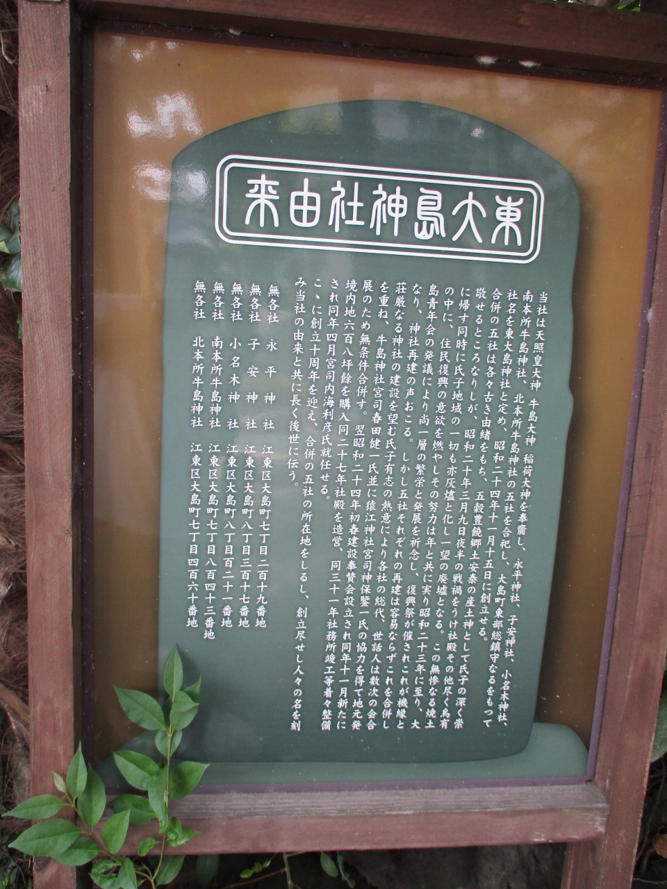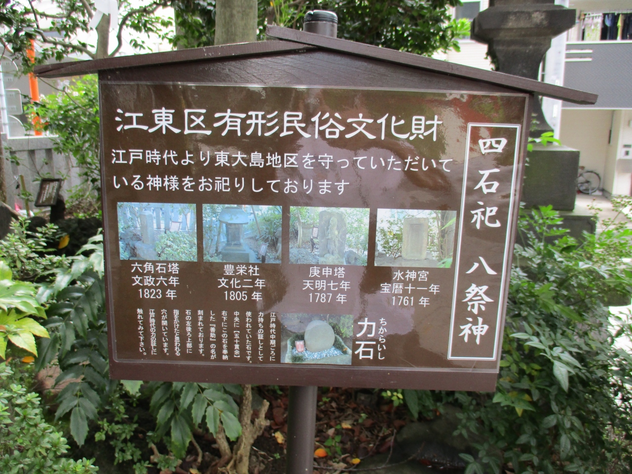 都営新宿線の東大島駅近くにある神社にお詣りがてら立ち寄りました。新大橋通りからちょっと中に入るので、静かな雰囲気の神社でした。境内はそれほど広さはありませんが、大黒天が祀られていたり、江戸時代の石塔や力石もあって、落ち着いた気持ちが良い神社でした。