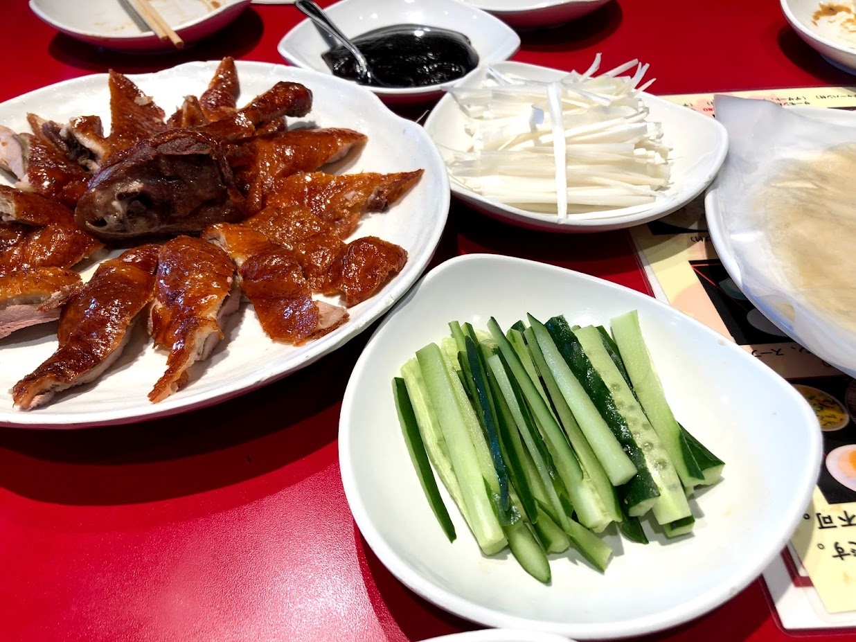 豊洲に3店もありますが、せっかくならば本店が雰囲気良いです。北京ダックは半羽で北京ダックとそのスープが出てきて、3人で食べても満足できます。きちんと皮だけでなく肉もあるので食べ応えあります。ランチはお値打ちですが炭水化物多いかな。