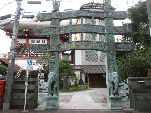 京急本線青物横丁駅から旧東海道方面進み青物横丁商店街の路地を入ると日蓮宗真了寺に着きます。真了寺は徳川家ゆかりの天妙国寺の塔頭として1673年 (延宝元年) に創建されました。青銅の山門は修行をするブッダの姿、象のデザインはエキゾチックで独特の雰囲気があります。ペット霊園がありました。