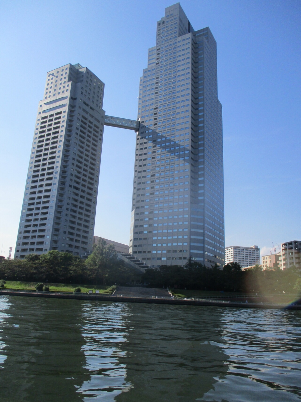 今回は隅田川をクルーズした折に、ガイドさんから案内されて知りました。タワーはオフィスなどが入っていて、レジデンスには有名芸能人などが居住しているんだそうです。二つのビルを繋ぐ橋が高いこと。次回見学したいです。