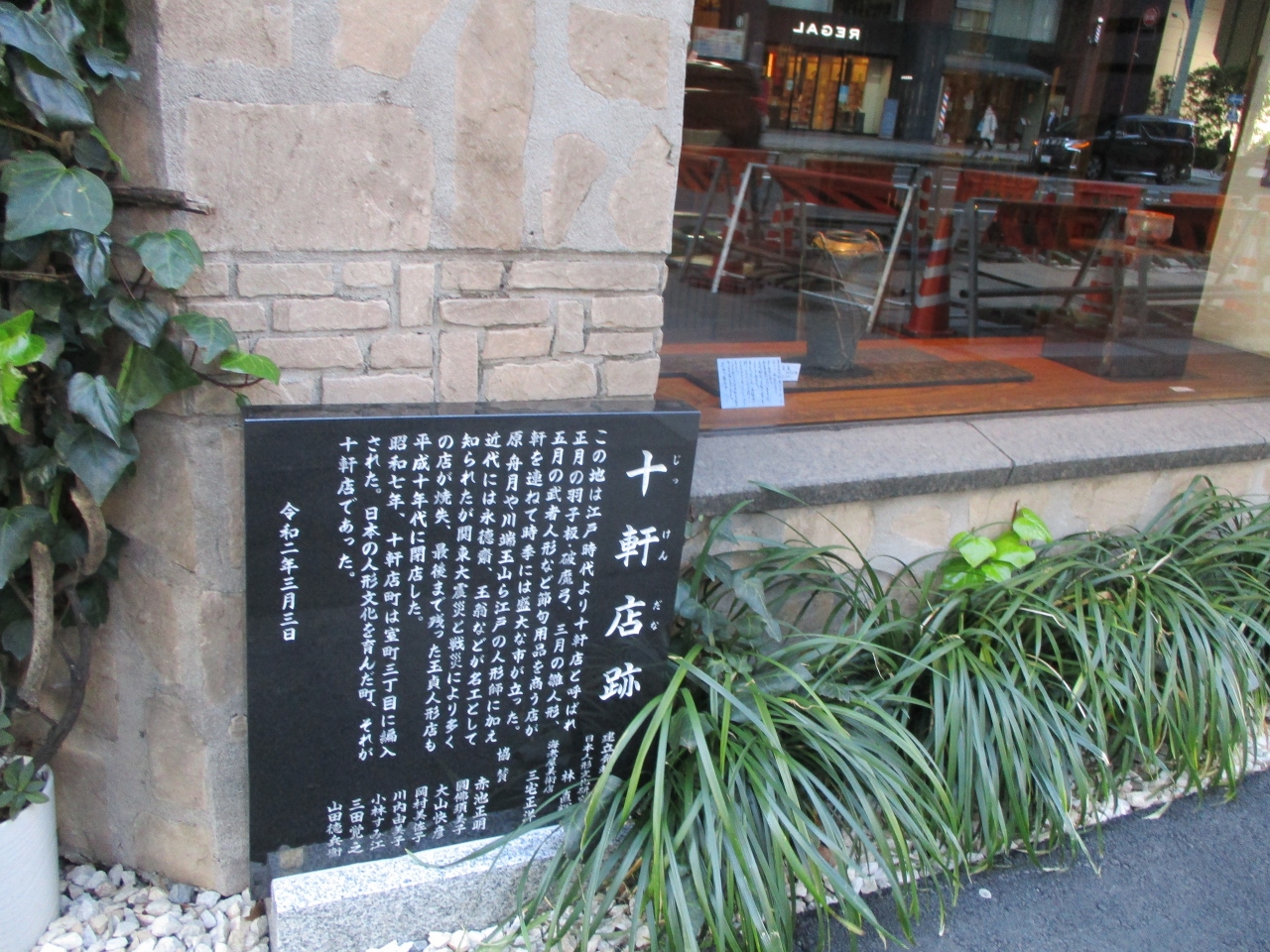日本橋の三越本館の近くを歩いていて、見つけました。ビルの壁に説明書きがあるだけでした。それによると、江戸時代にこの辺りに雛祭りやこどもの日のお祝いの人形や羽子板などの玩具を売る店が十軒並んでいたそうです。