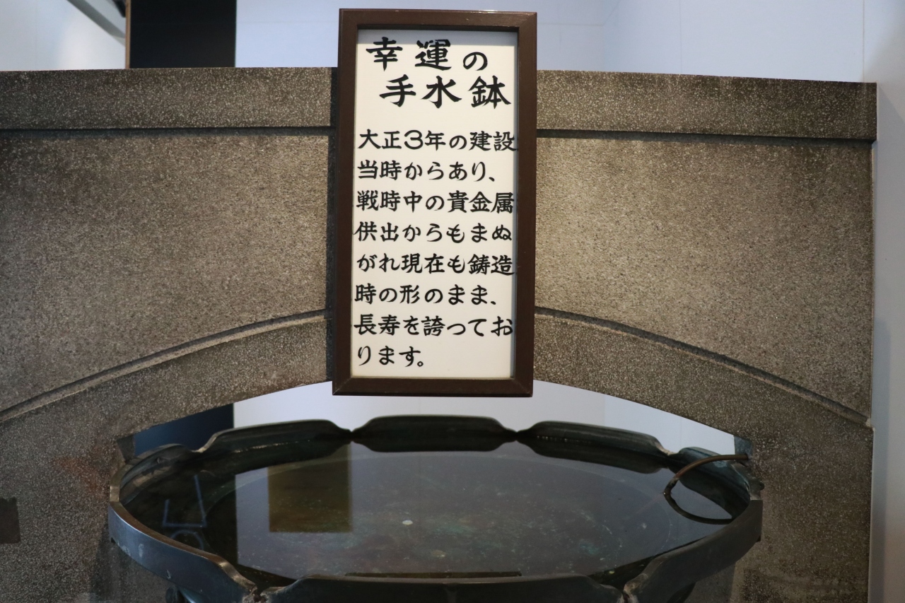 説明書きには大正三年からあるとありますが、もはやピンとこないほどの歴史があり、水が張ってありましたが今ではこうしたものを使う機会はないんだろうなぁと感じます。今の洗面台とは異なり高い位置にありますが、小さい子供などはどのようにして使っていたのでしょうか・・・?