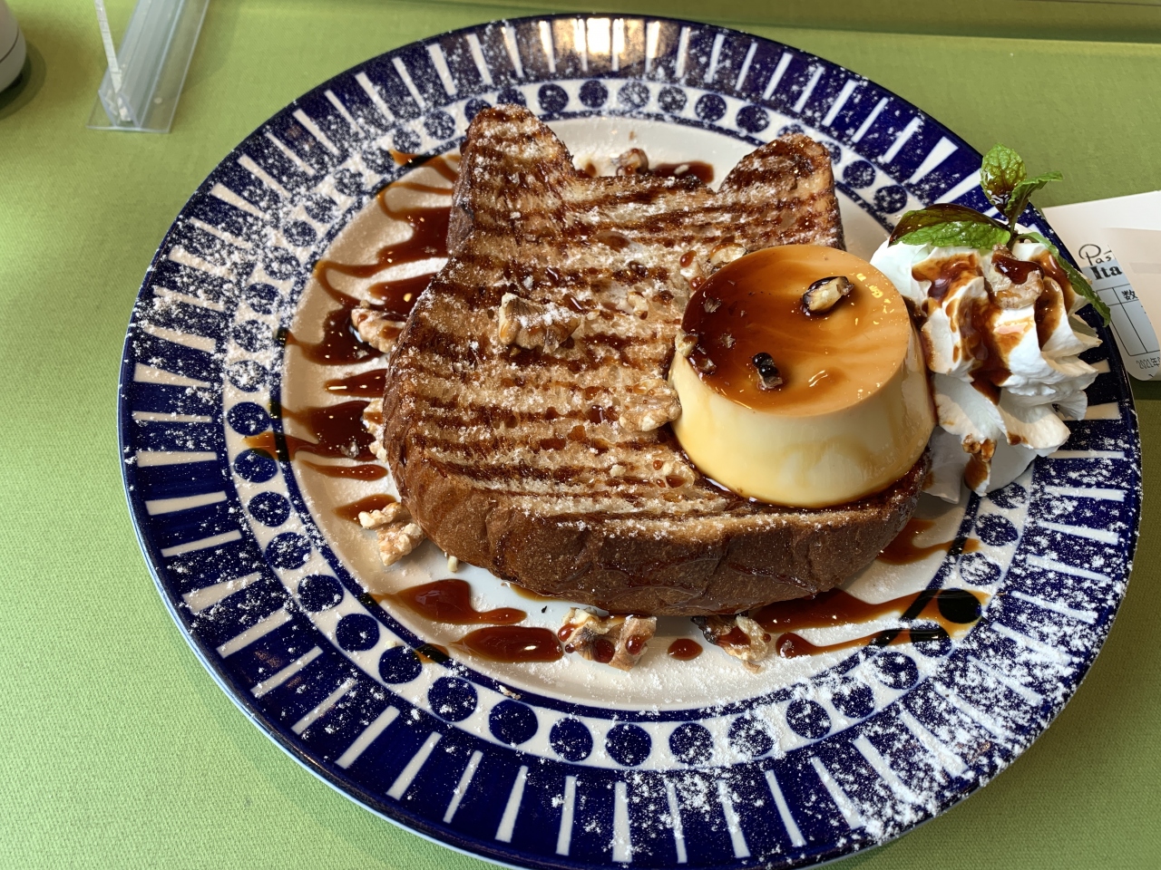 キャラメルプリントーストにしました。ねこねこパンの上にパステルのなめらかプリンが乗っています。最高です。