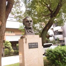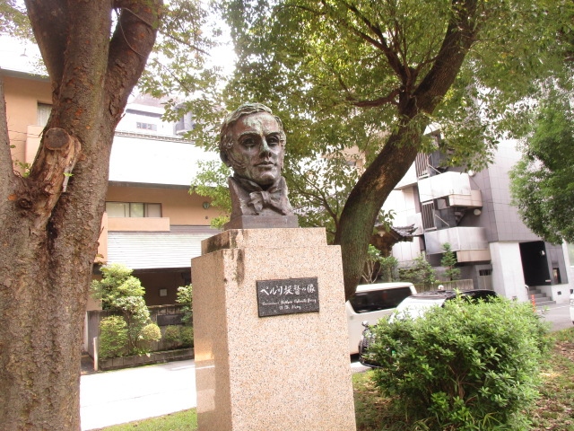 JR浜松町駅北口から増上寺大門をくぐり進み三解脱門に向かう手前の日比谷通り沿いの左手側の細長い芝公園10号地にペルリ提督の像に歩いて5分ぐらいで着きます。1948年日本開国100年記念祭を行ったときに東京都からアメリカ合衆国のニューポート市へ石灯籠1基を贈りその答礼としてペルリ提督の像を受け取ったそうです。日本史の資料集などで見た浦賀に来たペリー大佐(ペルリ提督)とはイメージがかなり異なりイケメンの像でした。