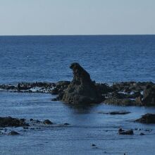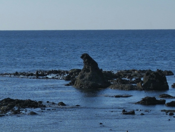 能登半島の先端珠洲市の馬緤町の海岸にある岩です。グーグルマップに掲載されているし、県道沿いに「ゴジラ岩」の標識があったので判りましたが、それほど大きくないのでよく見ないと見落としそうな地味なものでした。道路際に駐車場があります。