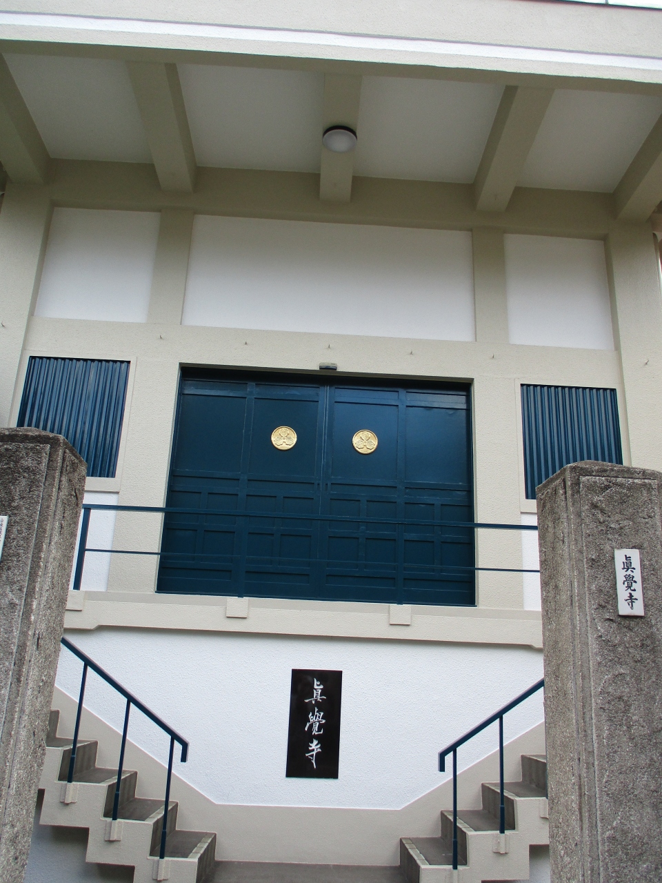 上野小学校近くを散歩していた時に、道路わきからすぐのところに本堂らしき建物が建っているお寺を見つけました。都会のわずかばかりの土地に建っているので、木々の茂みもなく、頑丈そうな青い色の扉が目立つ、ごくごく普通のお寺でした。