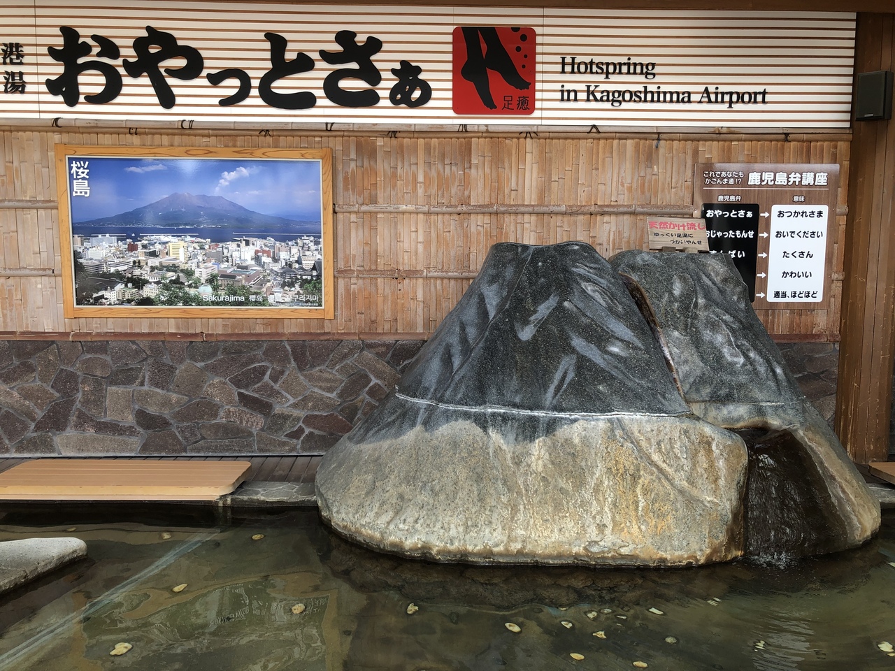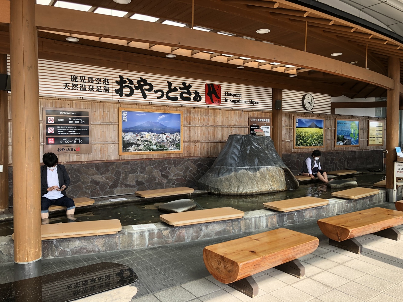 鹿児島空港国内ターミナルビル1階前面通路3番出入口横にある国内空港初の天然温泉による足湯施設。温泉が多数ある鹿児島をPRする施設として設置されたもので、利用料は無料。桜島や霧島をイメージした石製の山から温泉を注ぐ本格的なもので、屋根や梁、柱などには鹿児島県産の木材が使用されています。飛行機に乗る前に疲れた足を休めるのもよし、飛行機で浮腫んだ足を癒すにも良い。なかなかの施設です。