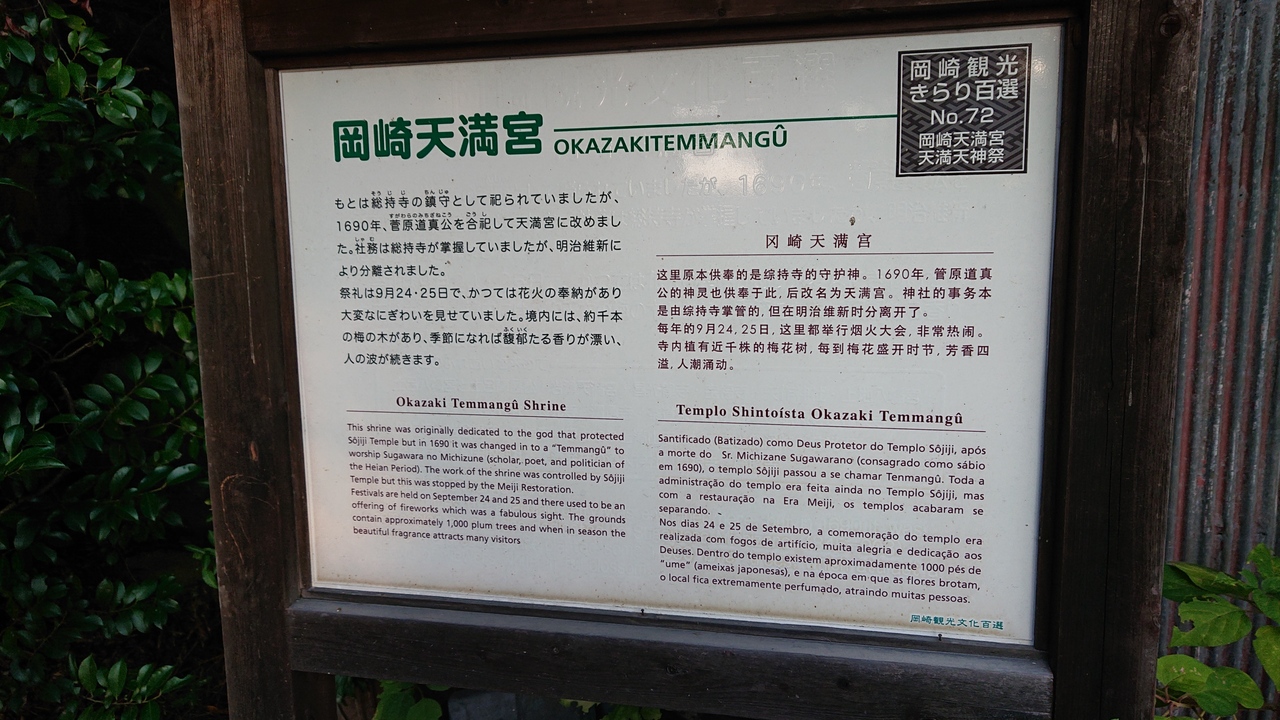 9月下旬の夕方に訪問しました。案内板の表示によると、元は、総持寺の鎮守だったものが、(西暦)1970年に、菅原道真公を合祀して、天満宮に改められた、とのこと。今回の訪問で特に印象に残ったのは、鳥居前の常夜燈。大正12年に建てられた旨が刻まれていましたが、かなり背が高くて、圧倒されました。