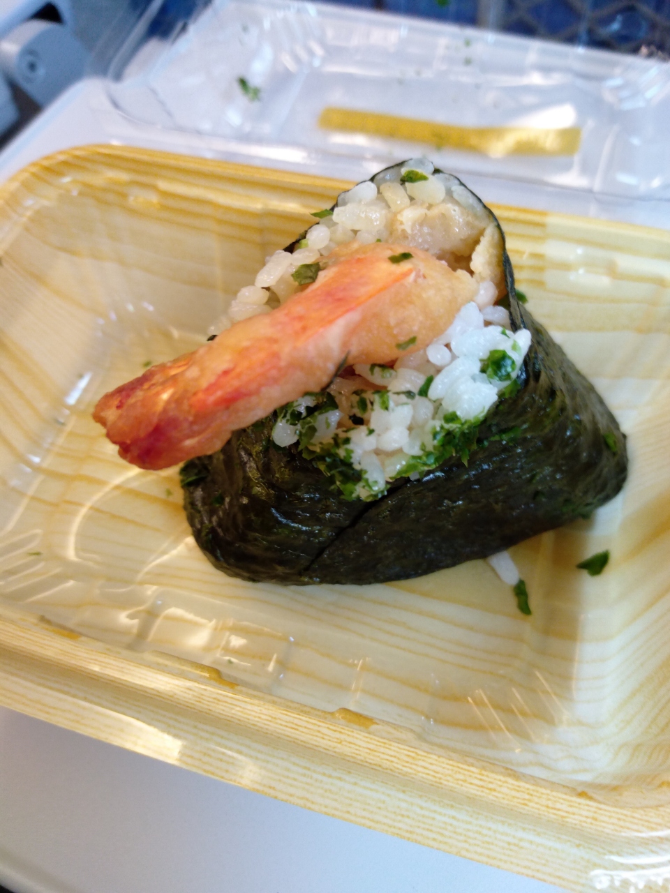 朝7時代なので、グランスタも一部しかあいてないためか、手ごろなおにぎり屋さんはすこし並んでました。時間にゆとりがあるから問題なかったが、4-5名並んでいた。1名づつ希望を伝えていくので時間がすこしかかるみたい。ほとんど海老天むすび をオーダー。ちょっと天ぷらが油っぽかった。新幹線の中でたべたが、東京からのぞみでなくて、ひかりにに平日のったのもあり、がらがらでノー密で食べれました。
