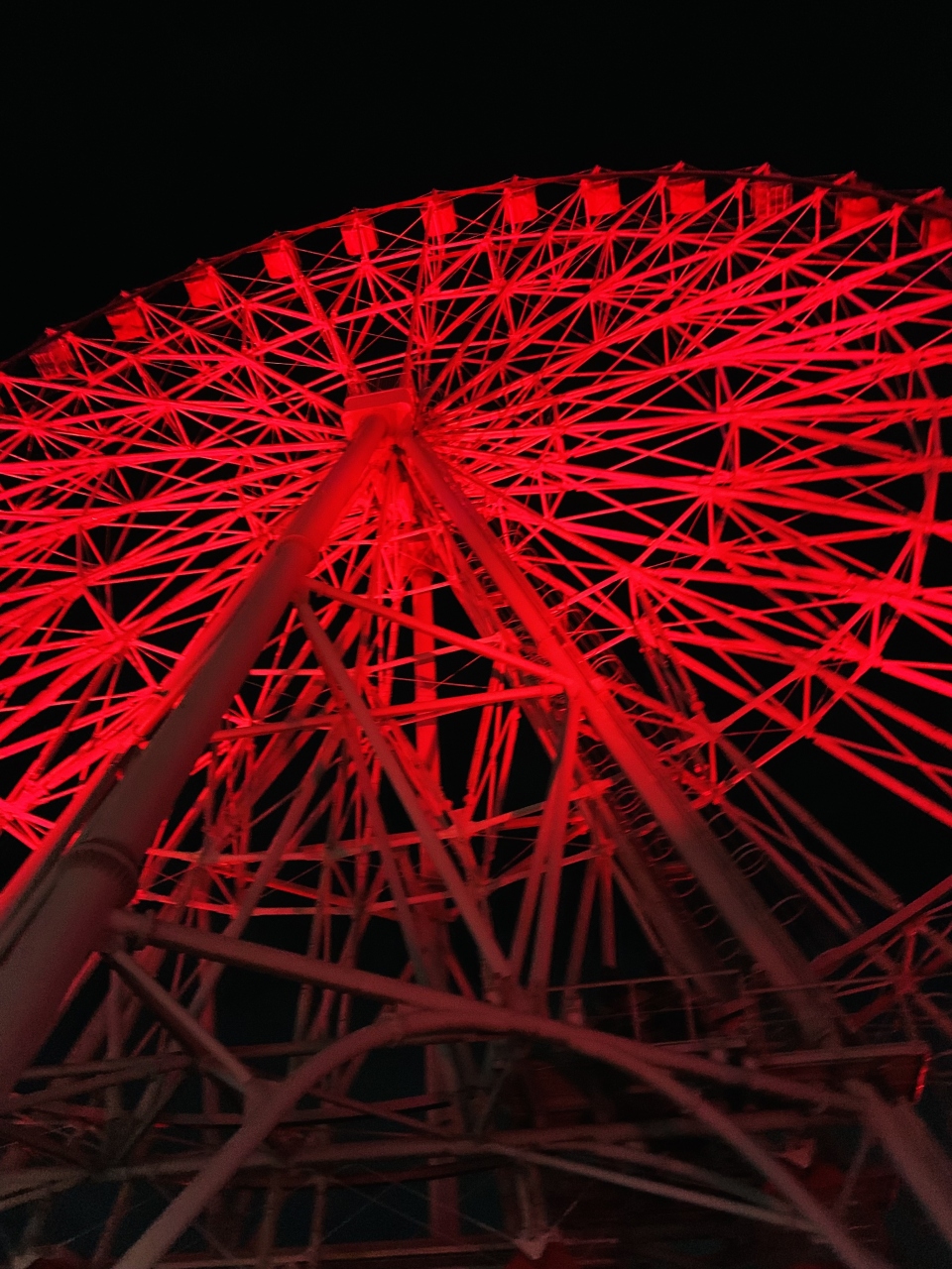 夜の観覧車の カラフルな イルミネーション が 遠くから見てもキレイで