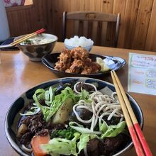 そばは、野菜、肉共にごろっとした具材がたくさん、しるもめんとおいしかったです。