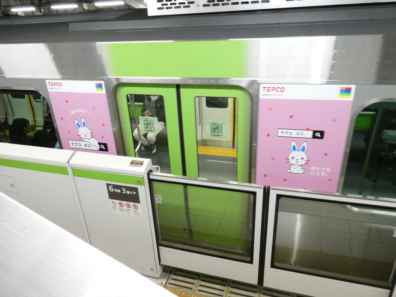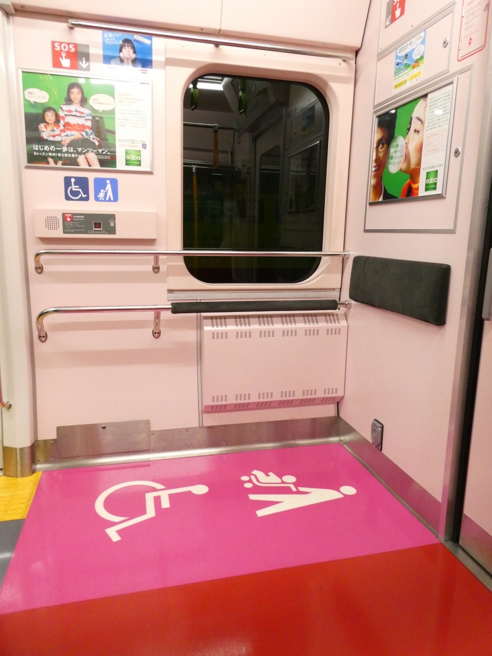 ラッシュ時なのに優先スペース付近は誰もいなく「あーこの付近の床はこんなに綺麗なピンクの塗装だったんだ!」と感心しながらゆっくり観察してきました。よく見ると車椅子やベビーカーのデザインはかなり車内でも目立ってますね!