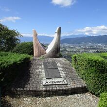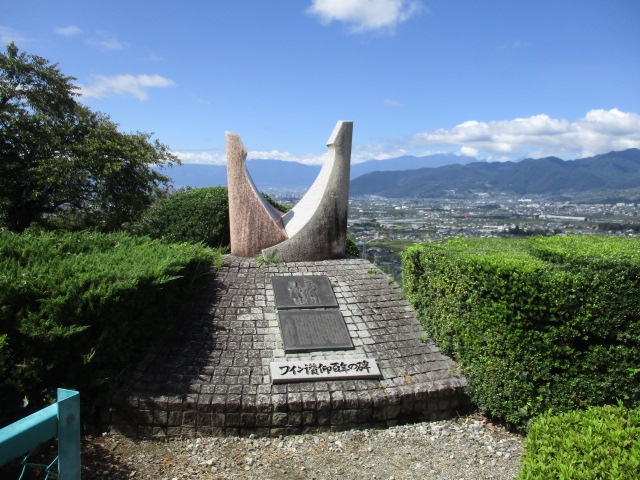 中央自動車道勝沼インタチェンジから勝沼ぶどう郷駅方面へ向かいブドウ畑に囲まれた小高い丘の上にあるぶどうの丘敷地内の天空の湯の先にワイン讃仰百年の碑があります。明治10年に若い二人が葡萄栽培、ワイン醸造を学ぶために欧州フランスに勉強に行って先駆者として勝沼を葡萄、ワインの街に築き上げる基礎を作った業績を讃える記念碑です。ぶどうの丘の葡萄畑を見下ろす場所に建てられてました。どの街にも凄い人達がいると改めて思いました。