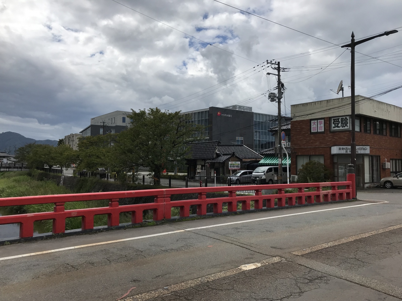 鶴岡市内を流れる内川に架かる橋で、朱塗りで目立っていました。欄干には擬宝珠が設けられていて、風格も感じます。名前の由来は、橋から「鳥海山、月山、金峰山」の三つの雪山が眺められることから付いたそうです。鶴岡公園に向かって、そのまま真っすぐに進むと、荘内神社の参道へ続いています。