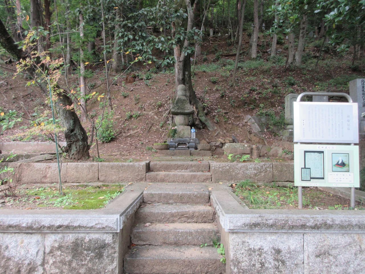 勝沼ICから国道20号線に出てすぐの柏尾交差点近くに建つ大善寺の墓地にあります。本堂の右にある下り坂の途中に説明板が立っていて、理慶尼墓があります。大善寺山門に武田信玄のいとこと言われている理慶尼の説明と武田家の最期を記した理慶尼記について説明板がありました。武田勝頼一行を寺に泊めたことも記してありました。下り坂の左斜面に建つ多くの墓の中でも広い墓所でした。