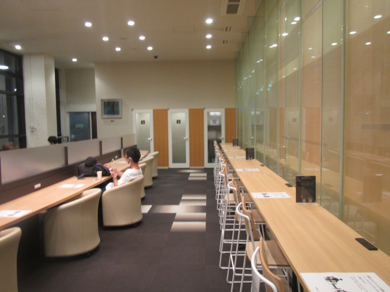 中ではジュースやコーヒーなどのドリンクサービスや新聞のサービスがあり、席はソファーやカウンター、テーブル席などがありましたが、アクリル板など新型コロナ対策が施されていました。
