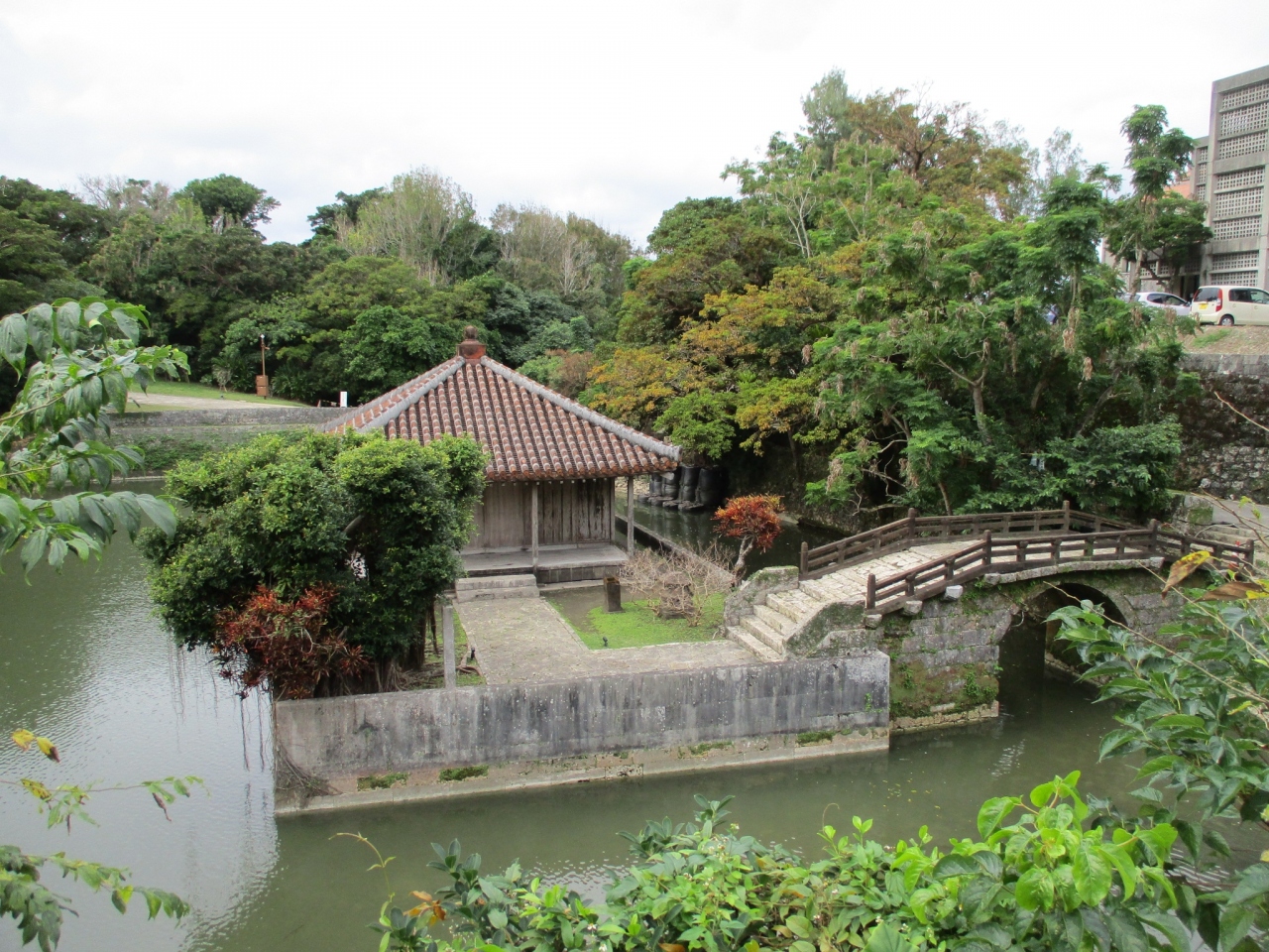 首里城近くの円鑑池中央にある弁財天堂へと渡る小橋です。アーチ状の石でできた古い橋ですが、欄干は木でした。円鑑池と弁財天堂、この天女橋で、日本庭園の雰囲気も感じられました。弁財天堂へと渡ることはできないようになっていたのが残念でした。
