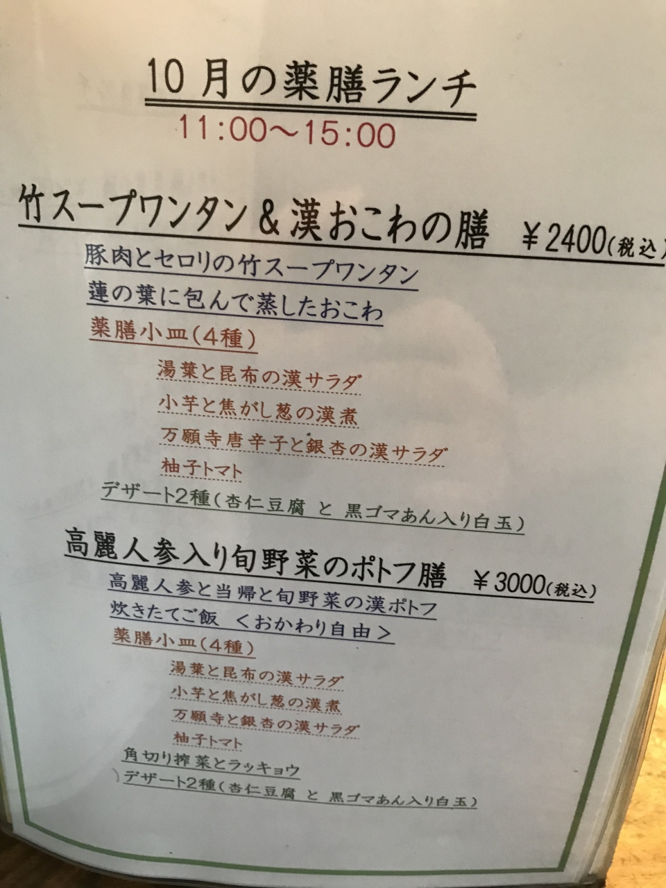 『茉莉花』の料理は、おばんざい薬膳といわれる中国は蘇州の家庭料理で、毎月、その季節その時期に摂りたい食材や生薬を選りすぐり、体にも心にもやさしい薬膳料理を提供するというのがコンセプトの店のようで、そのせいか、女性客がとても多く、しかも、予約客が多いらしい。
