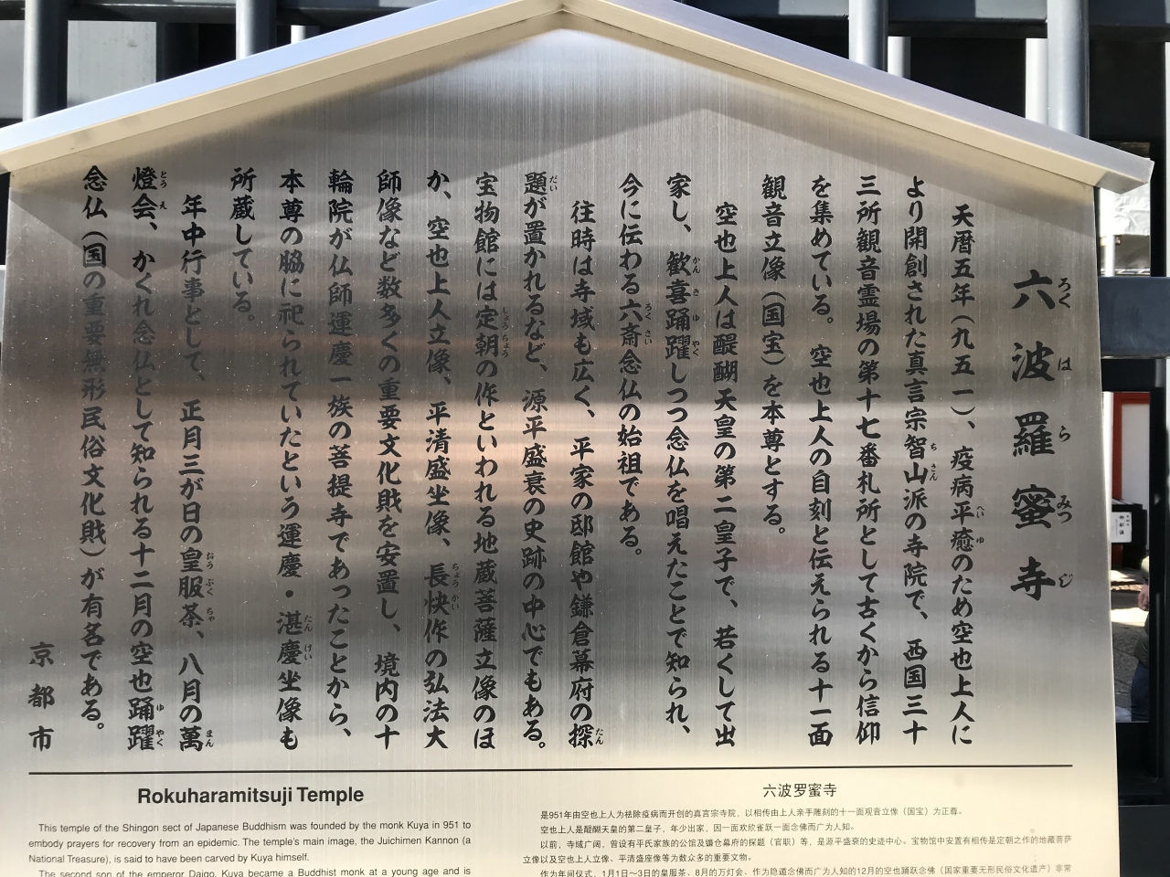 六波羅蜜寺は、東山区轆轤町にある真言宗智山派の寺院です。本尊は十一面観世音菩薩です。創建年は定かではありませんが、平安時代の歴史書によれば、踊り念仏で知られる市聖空也上人が平安時代中期の天暦5年(951年)に造立した十一面観音を本尊とする道場に由来し、当初西光寺と称したと伝わっています。空也は疫病の蔓延する当時の京都で、この観音像を車に乗せて引きながら歩き、念仏を唱え、病人に茶をふるまって多くの人を救ったそうです。境内には「銭洗い弁財天」があり、 金運を授かるように洗い清めたお金を持ち帰りました。