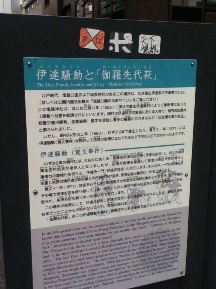 御成門駅北東の塩竈公園内に説明板がある。お勧めの点は、伊達騒動は1660年から1671年仙台藩伊達家に起こった御家騒動で、1660年伊達綱宗が幕府から隠居を命ぜられ亀千代(綱村)が2歳で家督を継ぎ藩政の実権を伊達宗勝・原田甲斐らが握ったが、保守派の伊達安芸らは宗勝らの失政を幕府に訴え、1671年老中の裁許によって宗勝らは処罰され保守派の勝利として落着したこと、伽蘿先代萩は伊達騒動を題材とした人形浄瑠璃および歌舞伎の演目で江戸時代から上演されてきた人気の演目であることである。訪問時の感想は、説明板では伊達騒動と伽蘿先代萩に分かりやすく解説されており、伊達騒動等について理解を深めることができ訪問して良かった。