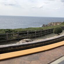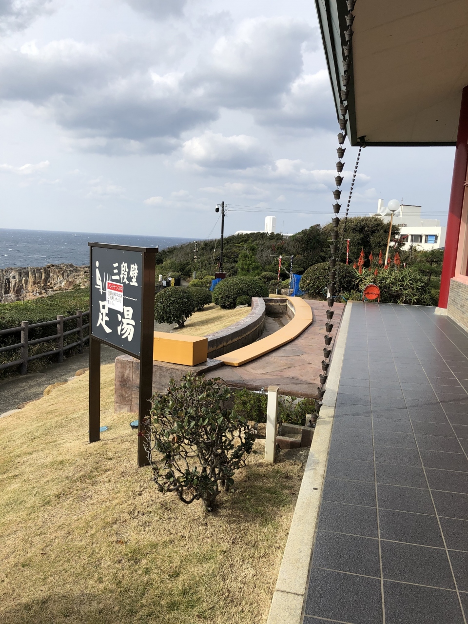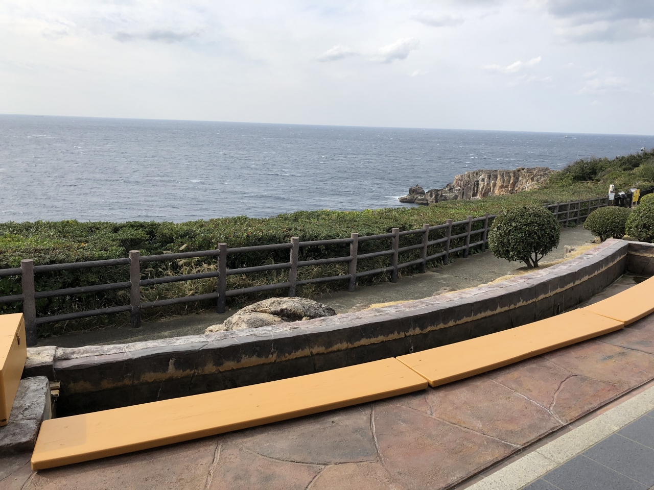 座わると、ちょうど海に向かう形に設計されている足湯です。ただ、コロナのせいで、訪問時はお湯は張られておらず利用中止となっていました。それほど大きい設備ではありませんが、ここで足湯ができたら、眺めも最高ですね。