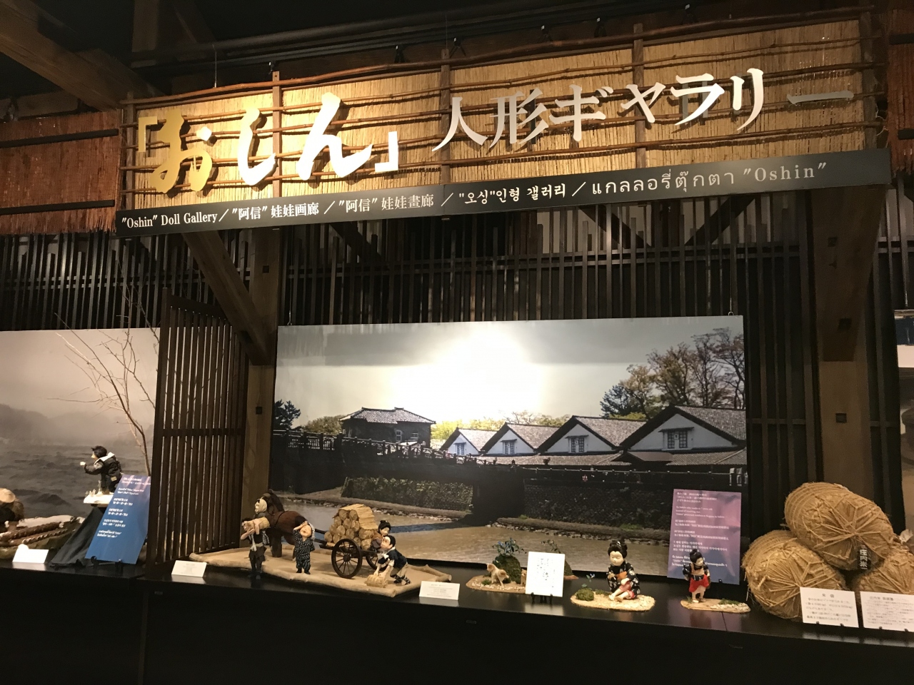 山居倉庫の駐車場側にある2棟が改装されて、観光物産館となっています。酒田の歴史や文化に関する展示が見られるほか、お土産が購入できます。展示コーナーでは、酒田が舞台となった朝ドラ「おしん」の人形ギャラリーがありました。