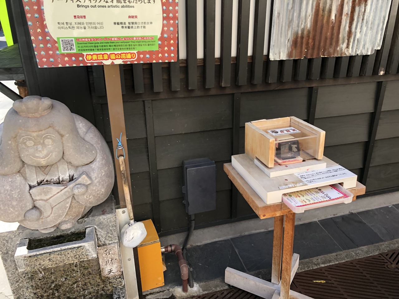 湯の花通り商店街に設置されている七福神ですが、弁財天は市川製茶さんのところに置かれています。こちらでお湯かけスタンプラリーで集めた七つのスタンプを見せて、七福神のステッカーと霊験願紙をもらいました。よい旅の記念になりました。