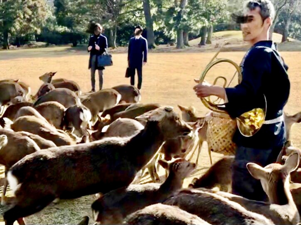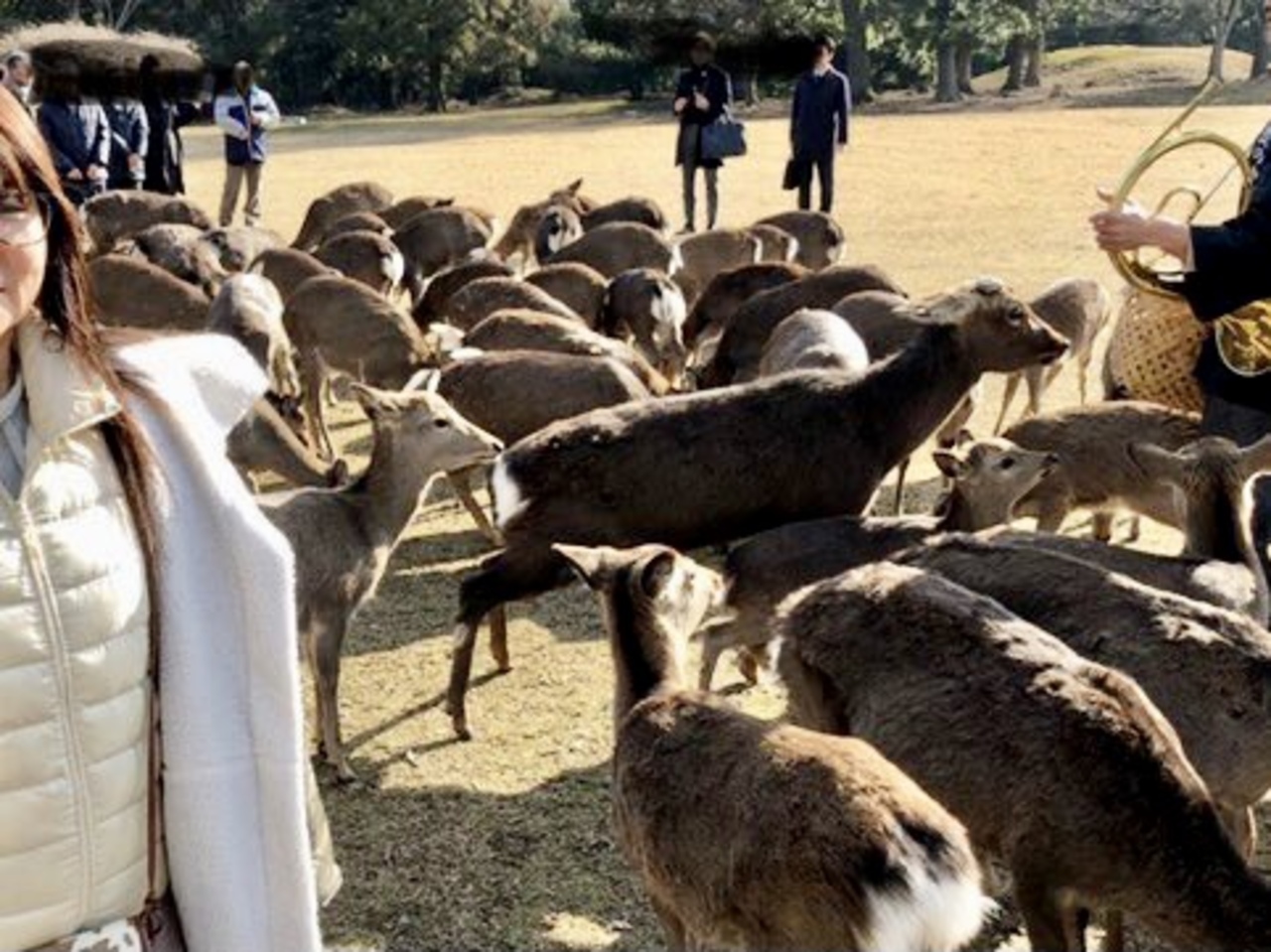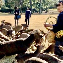 奈良旅行の宿泊翌日に、鹿寄せがあるとの情報を聞いて、10:00からの鹿寄せを見るため、奈良公園の春日大社境内地「飛火野」に行ってみました。ナチュラルホルンの音色で鹿が、四方八方から集まってきました。30分くらいのイベントでしたが、大満足。奈良ならではの貴重な風物詩を見ることができました。