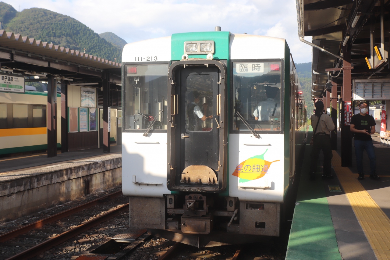 土休日を中心に仙台から直通の快速「湯けむり号」が運転されています。観光列車で車窓の案内もありました。沿線にはたくさんの温泉郷があり、「温泉」と名の付く駅が続きます。基本は全車指定席ですが、この日は自由席で一般車両が使われていました。