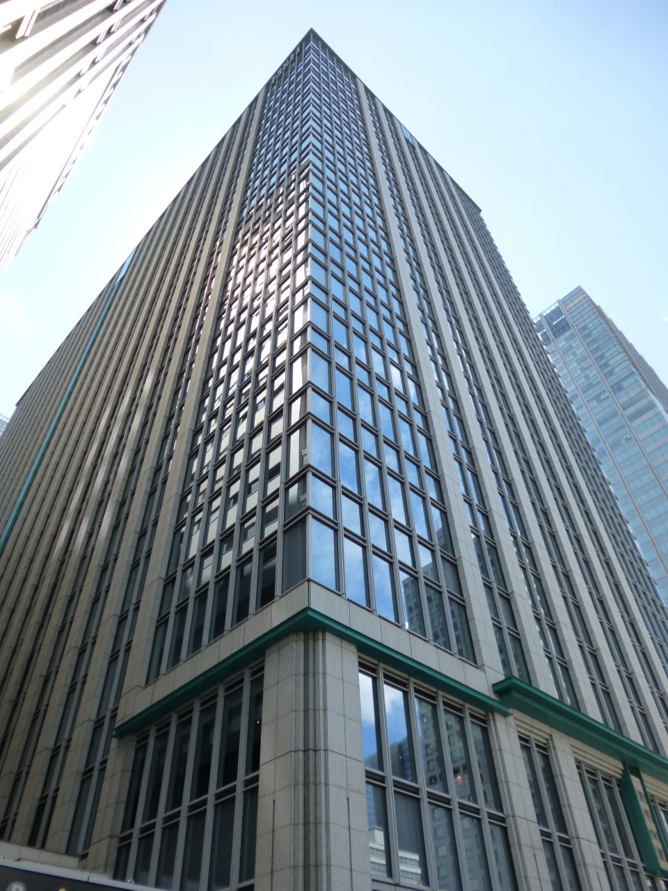 「鉄鋼ビル」は、呉服橋交差点の南西側に建つ高さ135メートルの高層ビルです。2015年竣工の比較的新しいビルで、外堀通りに沿って南北に長い形状が特徴的です。永代通りを挟んで北側には真新しい「常盤橋タワー」が聳え、高層ビルが居並ぶ光景は圧巻です。