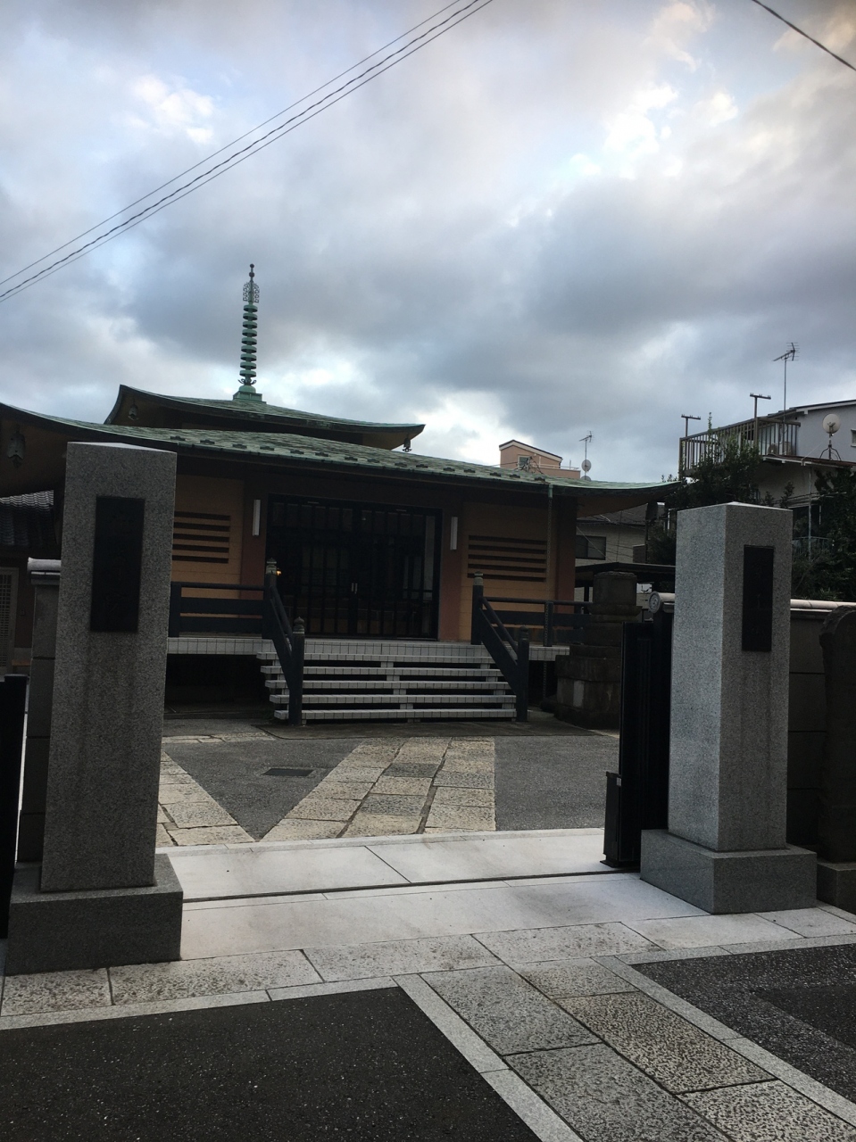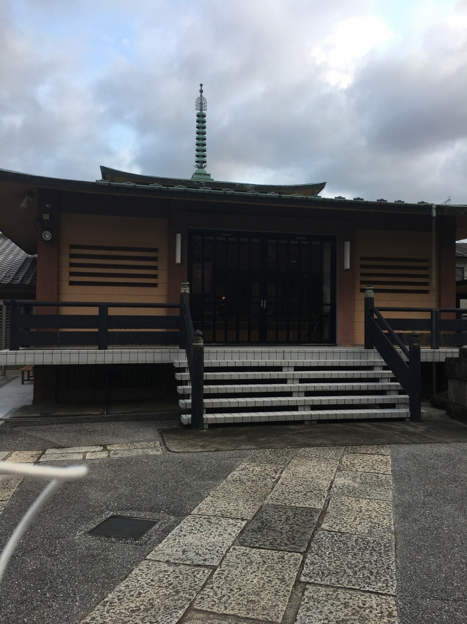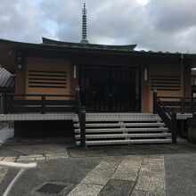 本堂の屋根の上に塔のような物が立っていました。幹線道路から細い道を曲がると寺があり、四角い現代的な本殿で、境内の地面は舗装されていました。本堂の扉は横に引くタイプで階段5段ほど上がることとなります。賽銭箱等はなかったです。