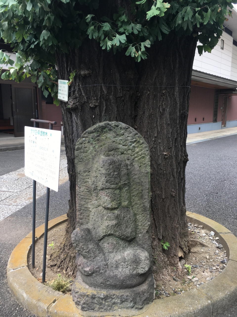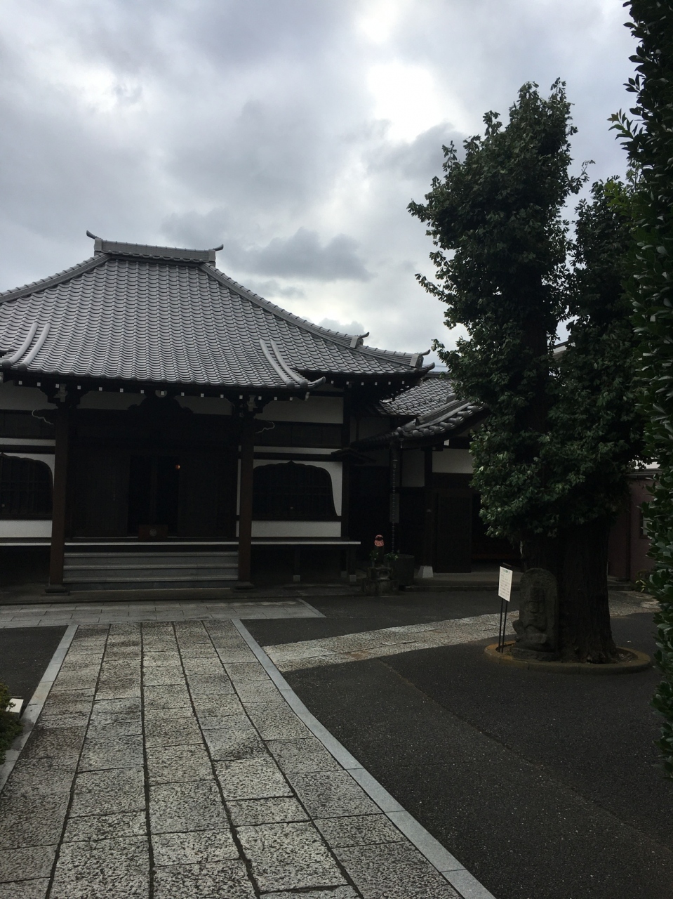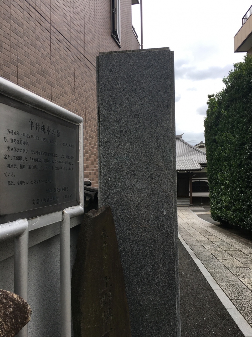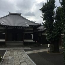 半井桃水という昭和初期に活躍してした作家のお墓があり、境内入ると右側に、壁のような平べったい整備された草がありました。正方形型の本堂で右側に小さな地蔵さまがあり、大きな木の下にも年季入った地蔵さまがあり顔が潰れていました。