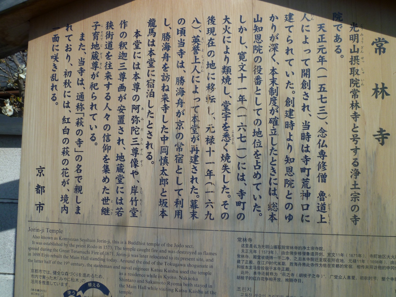 常林寺は、京阪電車「出町柳」から南へすぐの場所にあります。1573年、念仏専修僧、魯道により開創され、当初は知恩院と関わりが深かったそうです。1671年寺町の大火により焼失し、その後現在地に移っています。若い頃の勝海舟が海軍伝習生として、長崎、神戸に向かう際にここを宿坊として使っていたといわれています。初秋には境内一面に萩の花が咲くことから「萩の寺」とも言われています。