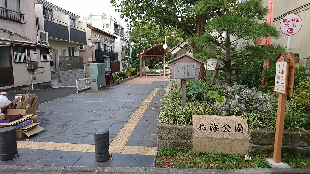 品川区北品川1丁目の旧東海道沿いにある小さな公園で、公園入口に品川宿の石碑が立っています。東海道五十三次の第一宿・品川宿の有った場所です。小さな公園で、特に目立った施設はありませんが、品川宿の石碑があるので、旧東海道散策の際には訪問をおすすめします。