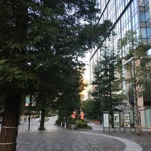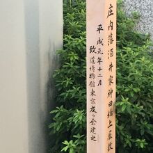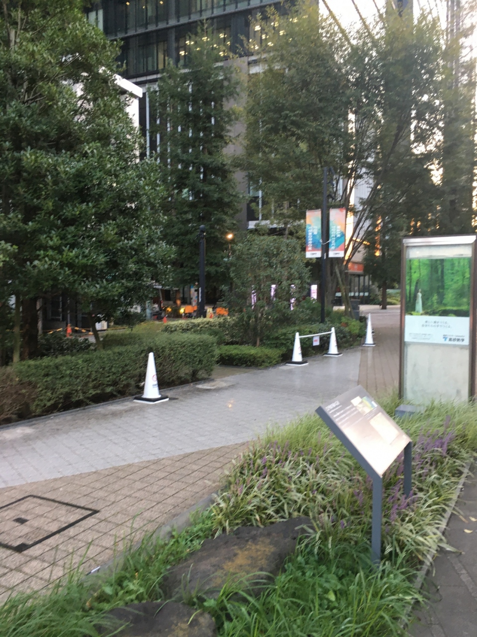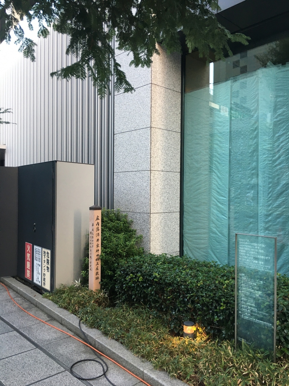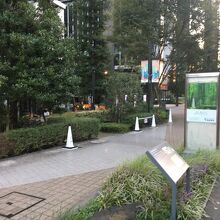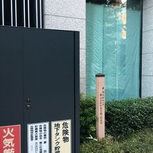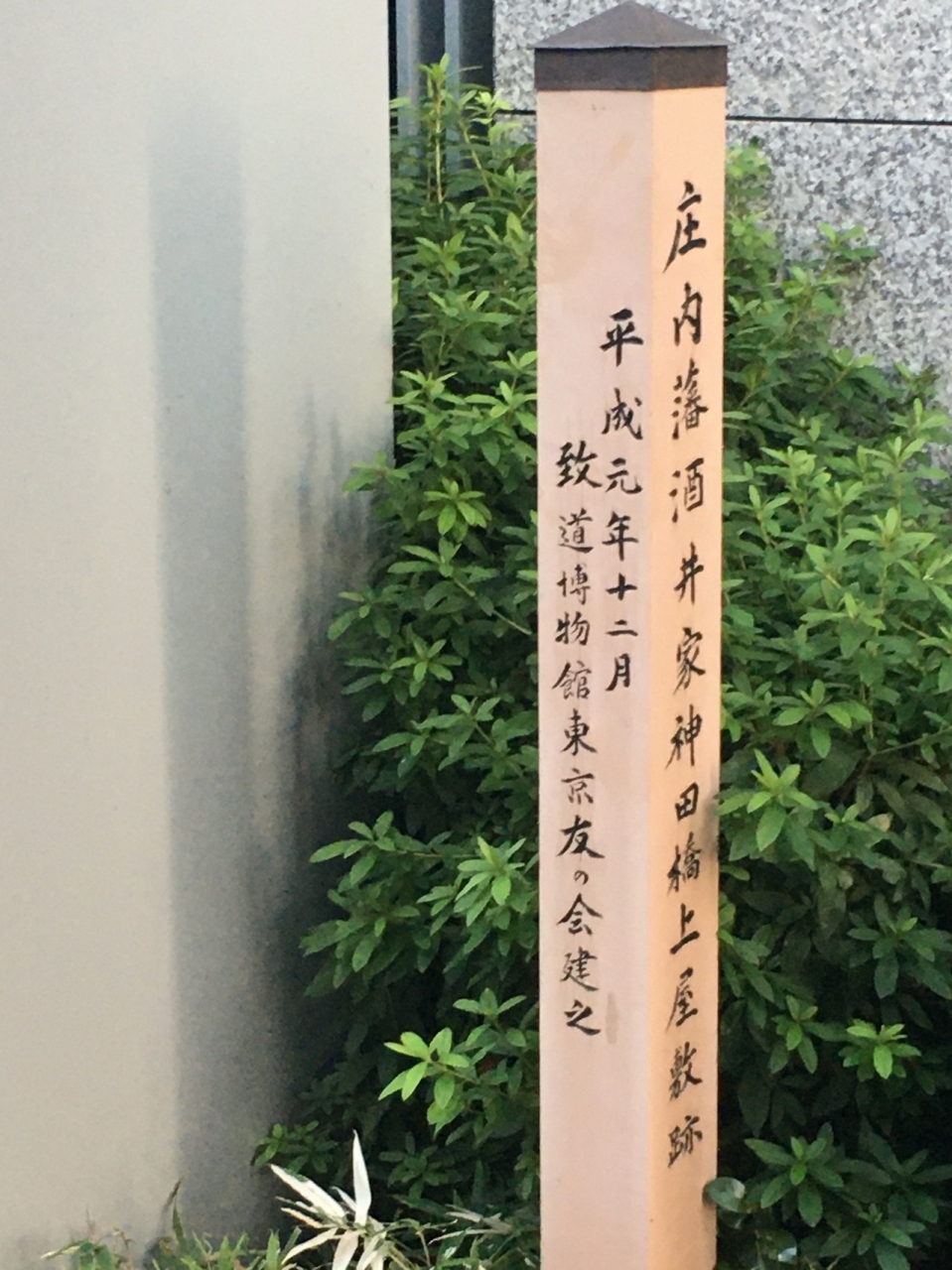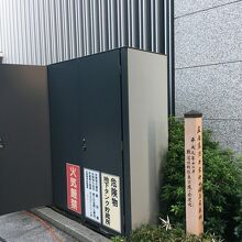 鎌倉橋と神田橋の脇の真ん中あたりの遊歩道沿いにあり大きなビルの横の整備された草の中に、木の碑のみ立っていました。比較的新しい碑らしく綺麗でした。屋敷の面影は今では全くなく、近くに石垣があるのが江戸時代を感じました。