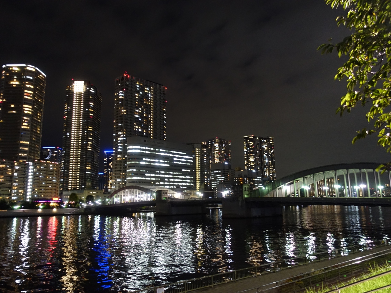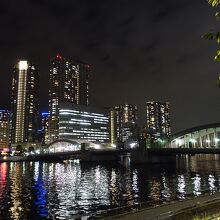 勝どき橋のたもとにある「はとば公園」から、勝どき橋の夜景を鑑賞しました。ゆったりと流れる隅田川、川の向うには、月島や勝どきの高層ビル群、そして水面には勝どき橋のネオンが反射し、時々刻々と色と姿を変え、何とも言えぬ美しい光景でした。