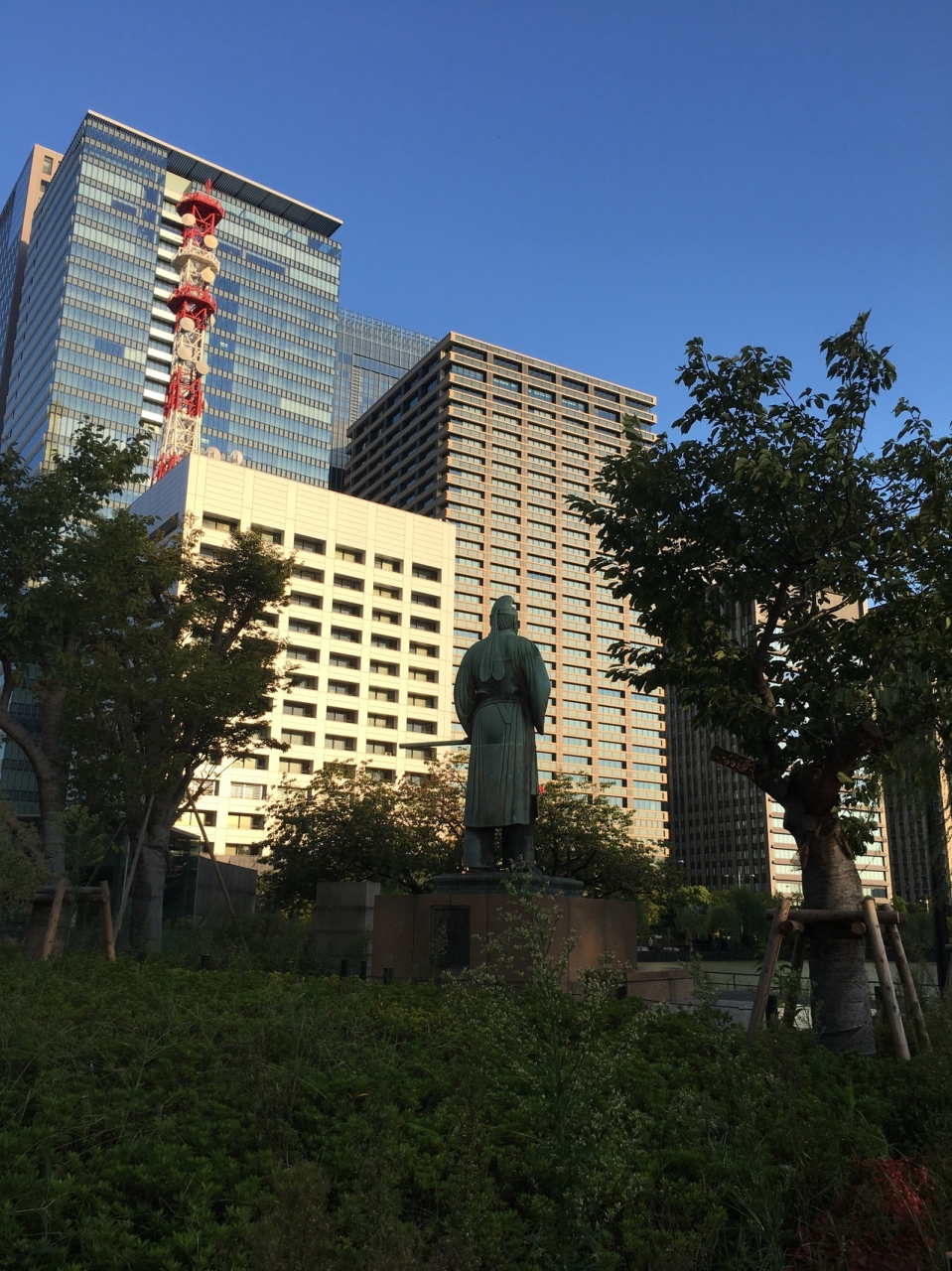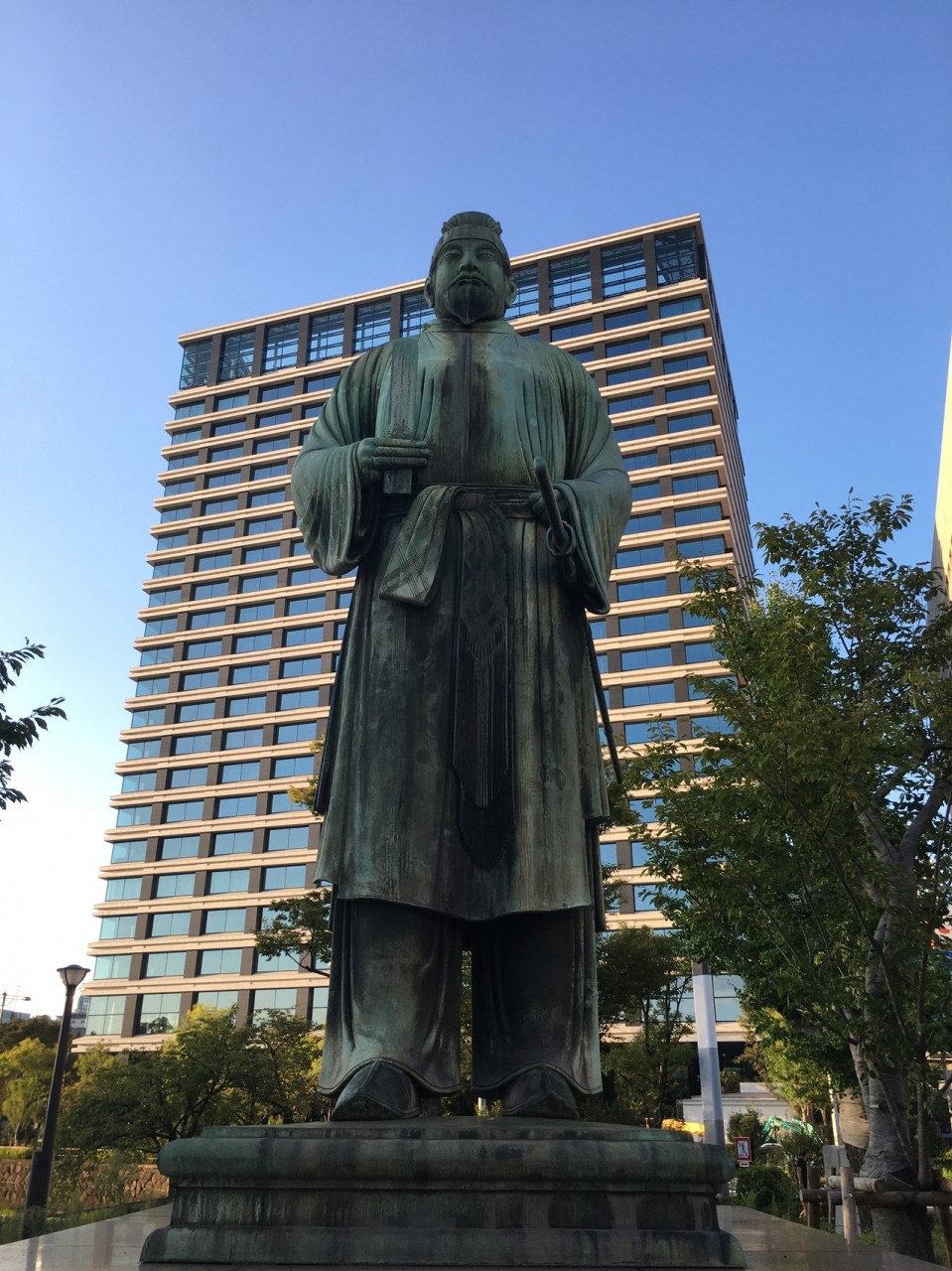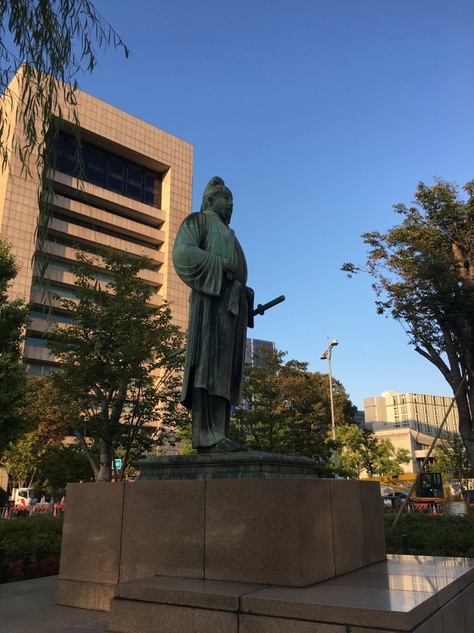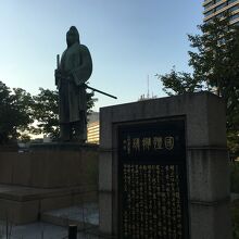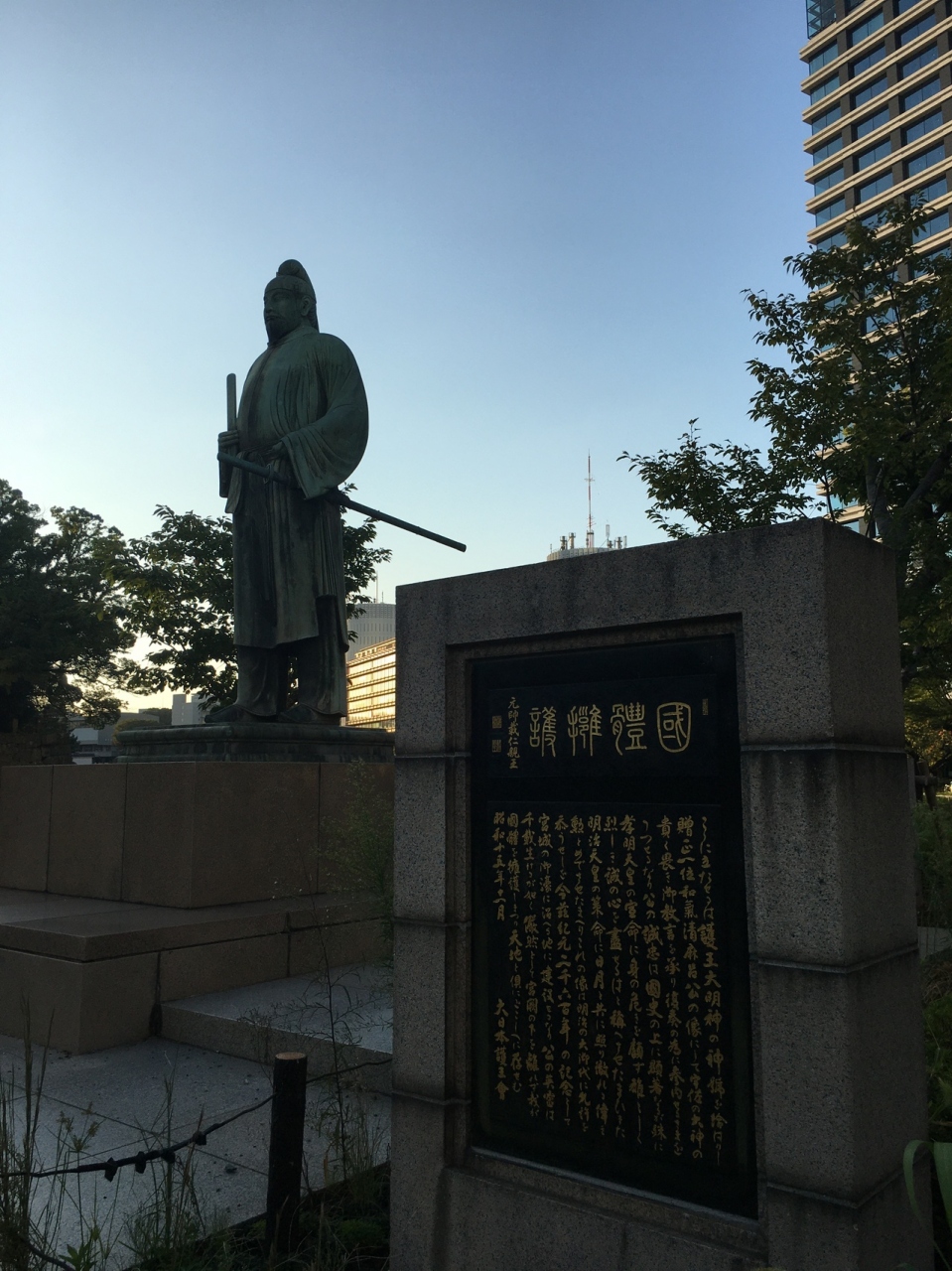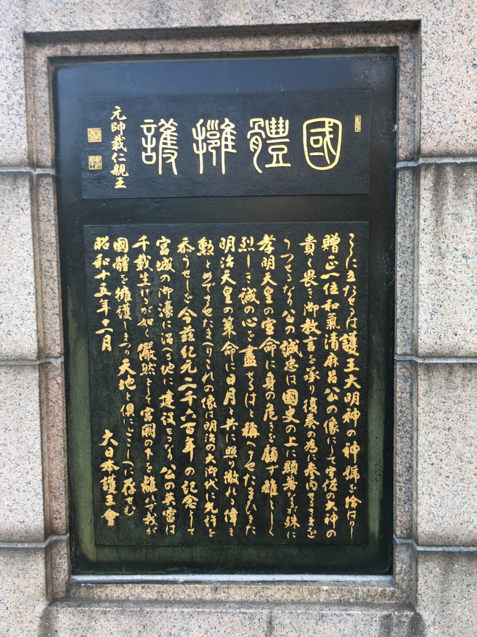 皇居に堀沿いに建っている大きな像でした。正装し刀を刺し、昔の中国の武人のような菅で髭を生やし土台にのっていました。ミニ公園内にあり皇居の方を向いていました。横には黒い下地に金色の説明文がありましたが読みにくいです。